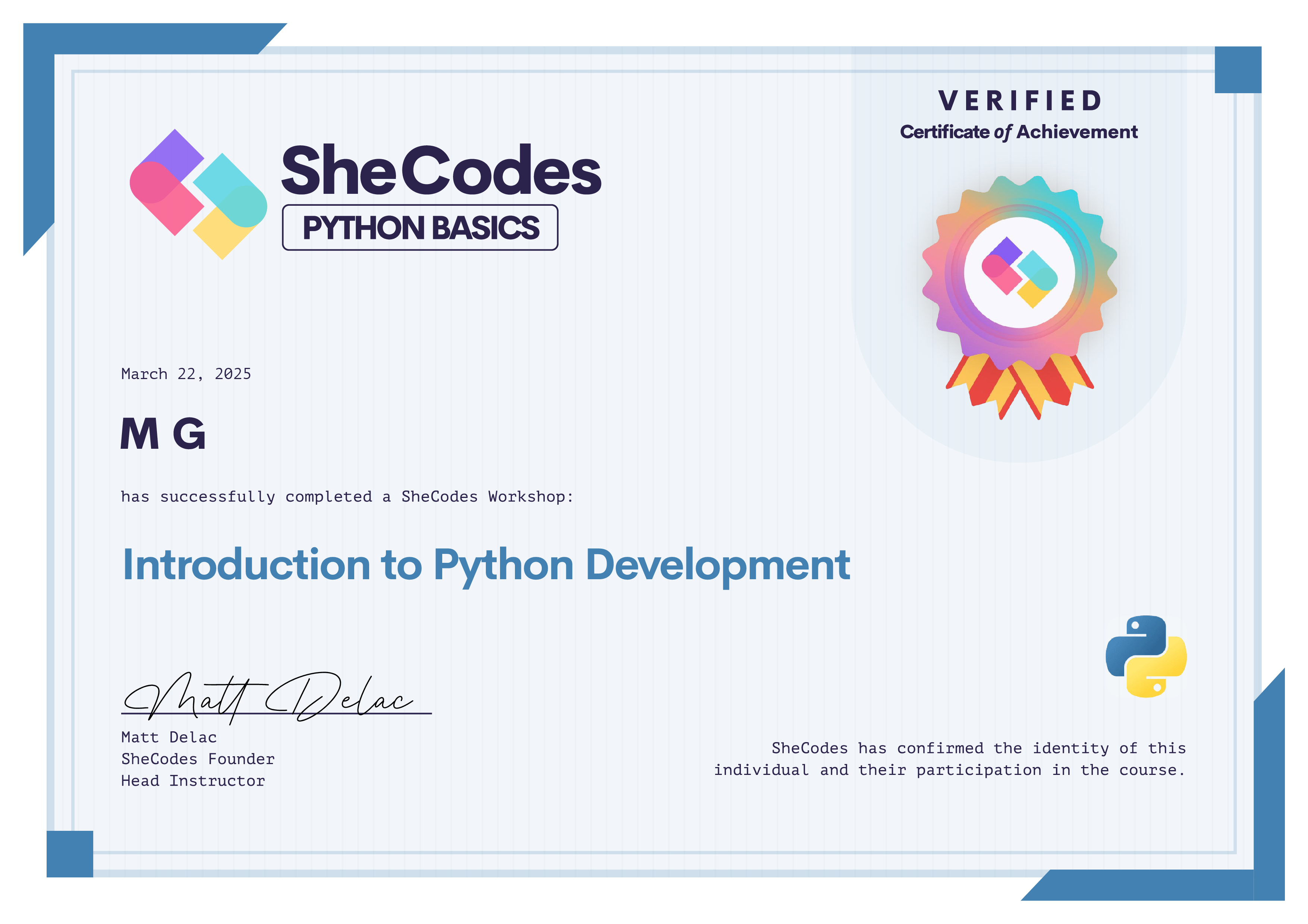 M successfully graduated from at least one SheCodes Coding Workshop and is featured in the SheCodes Hall of Fame