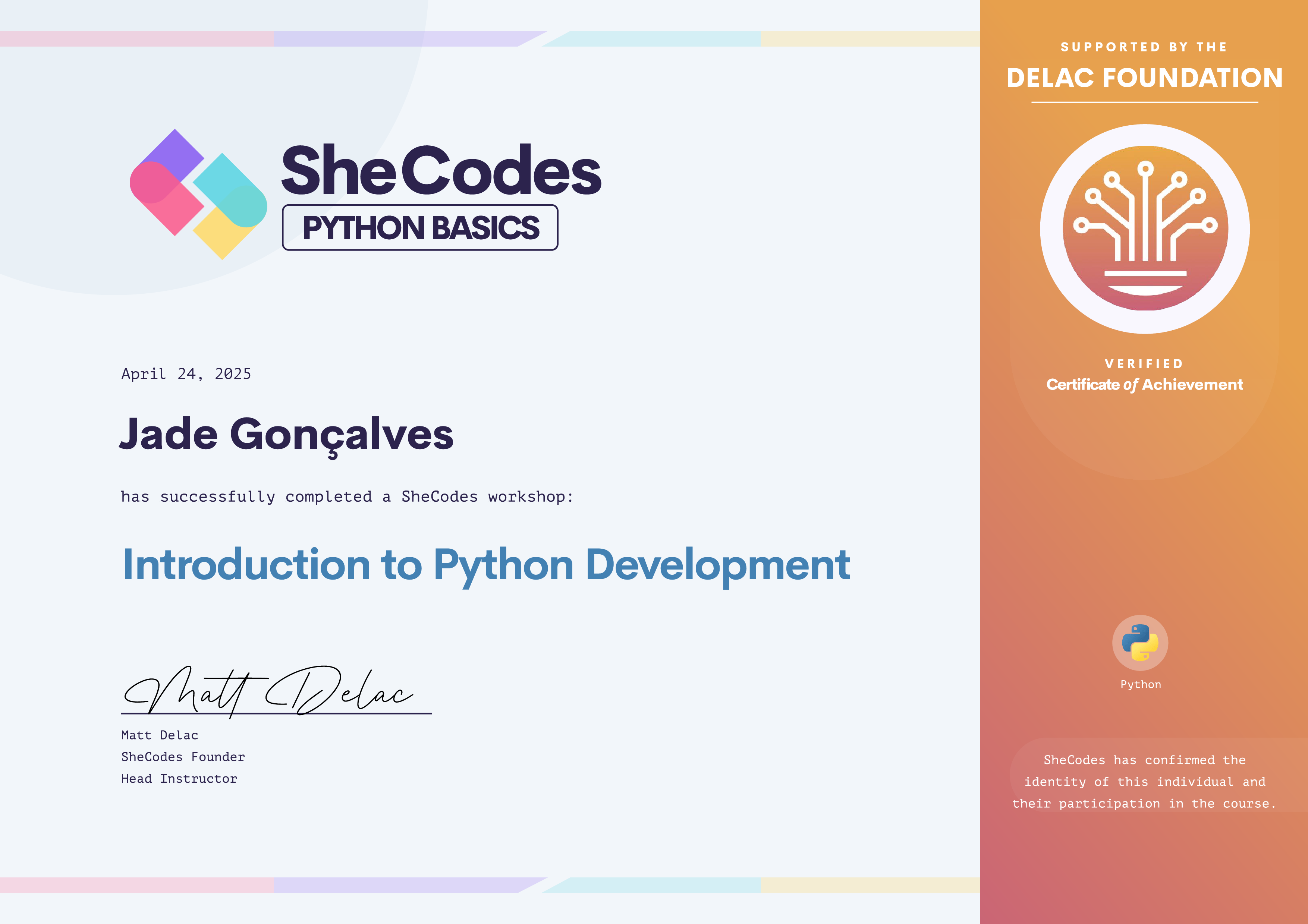 Jade has been fully supported by the Delac Foundation to complete this SheCodes Workshop