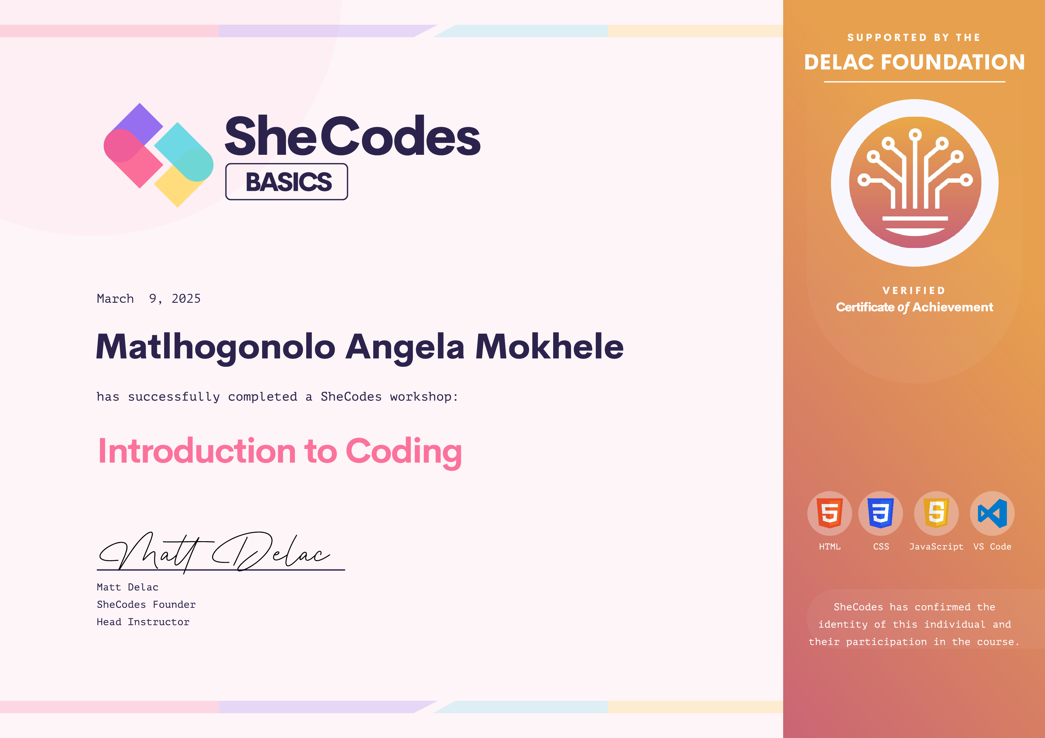 Matlhogonolo Angela has been fully supported by the Delac Foundation to complete this SheCodes Workshop
