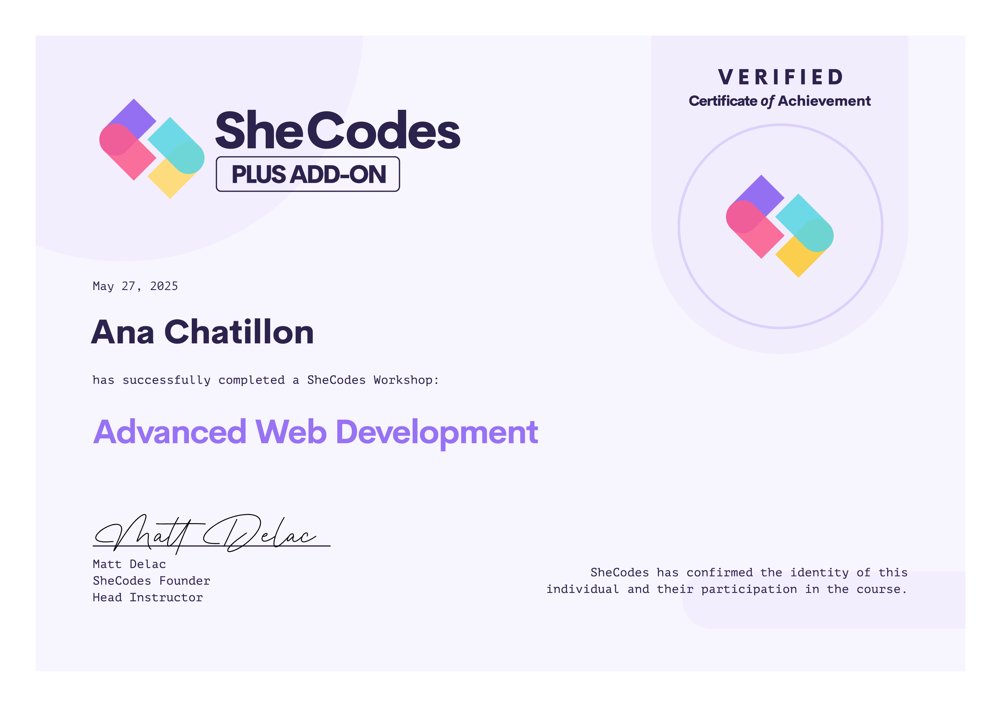 Ana successfully graduated from at least one SheCodes Coding Workshop and is featured in the SheCodes Hall of Fame