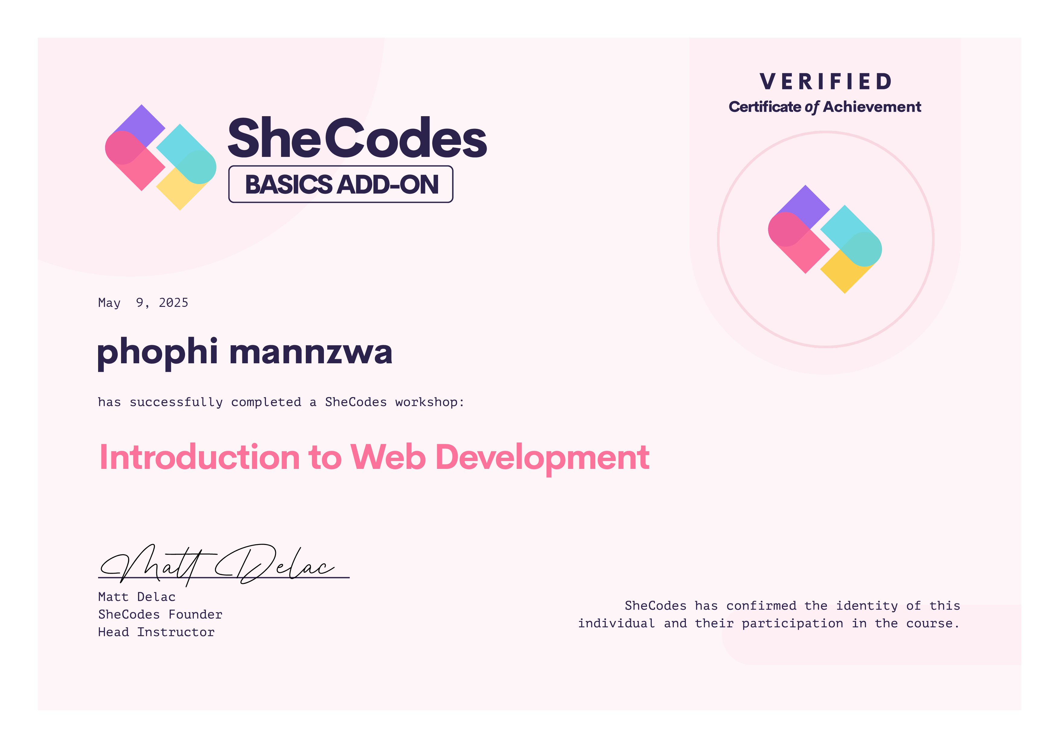 phophi successfully graduated from at least one SheCodes Coding Workshop and is featured in the SheCodes Hall of Fame