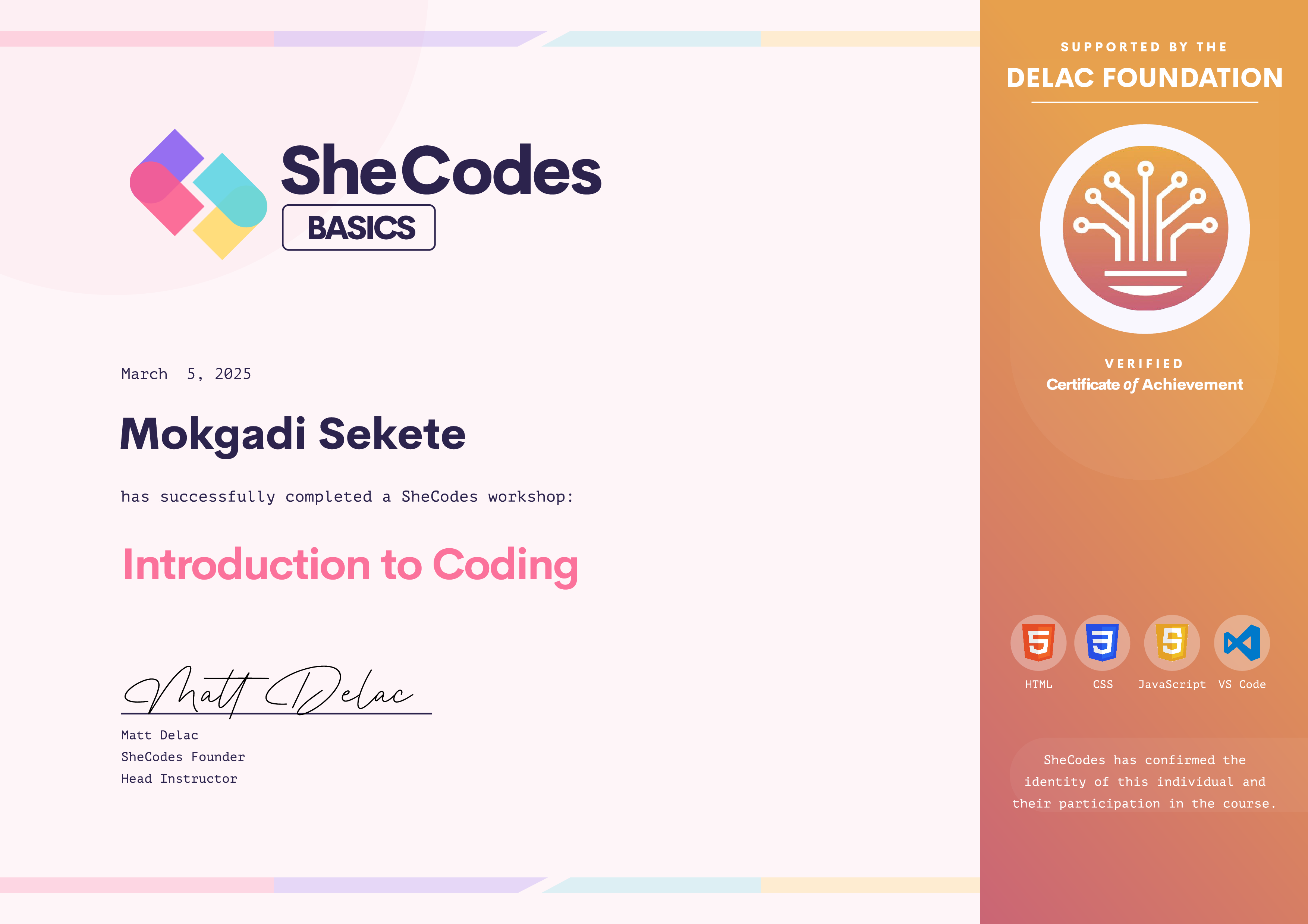 Mokgadi has been fully supported by the Delac Foundation to complete this SheCodes Workshop