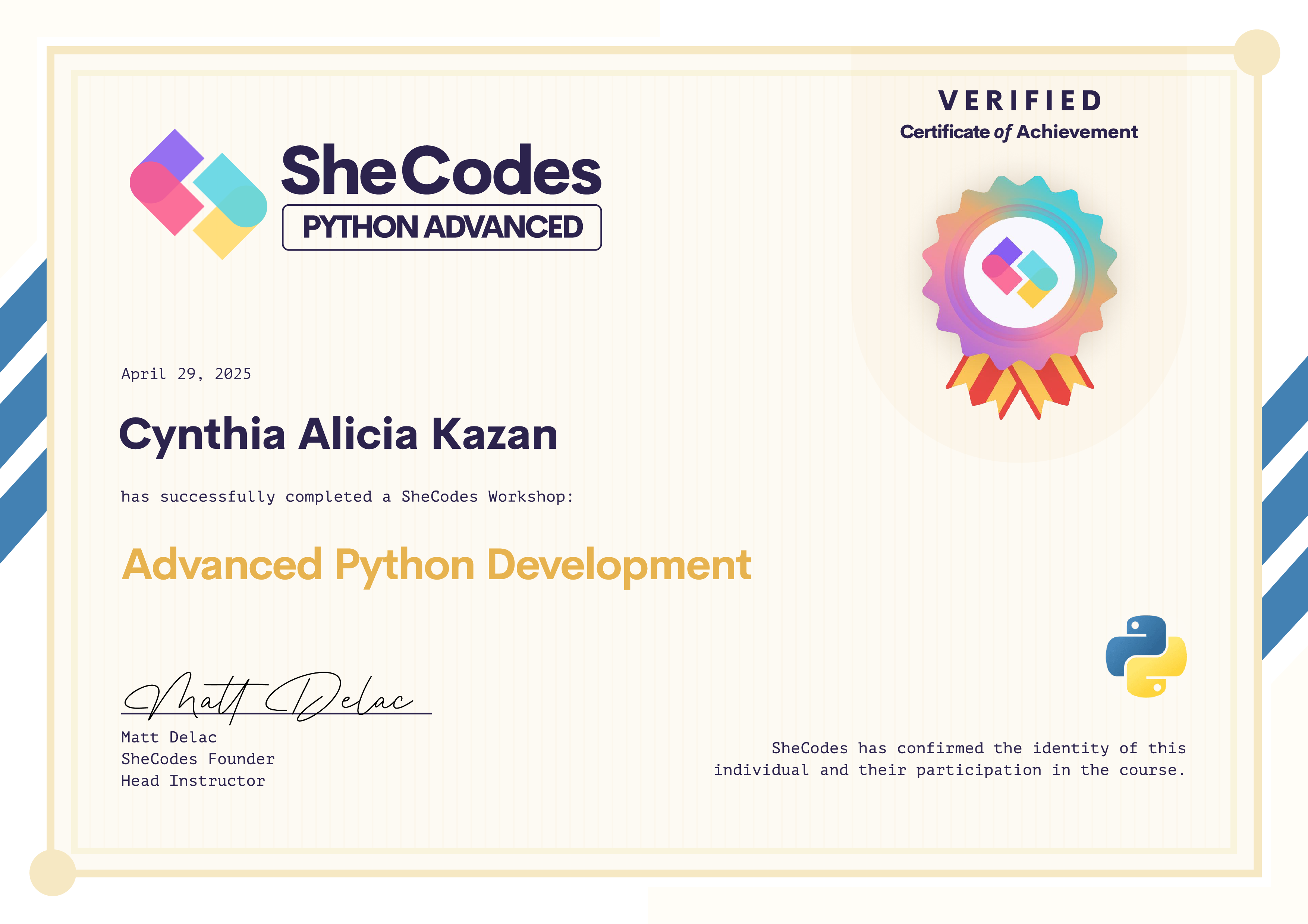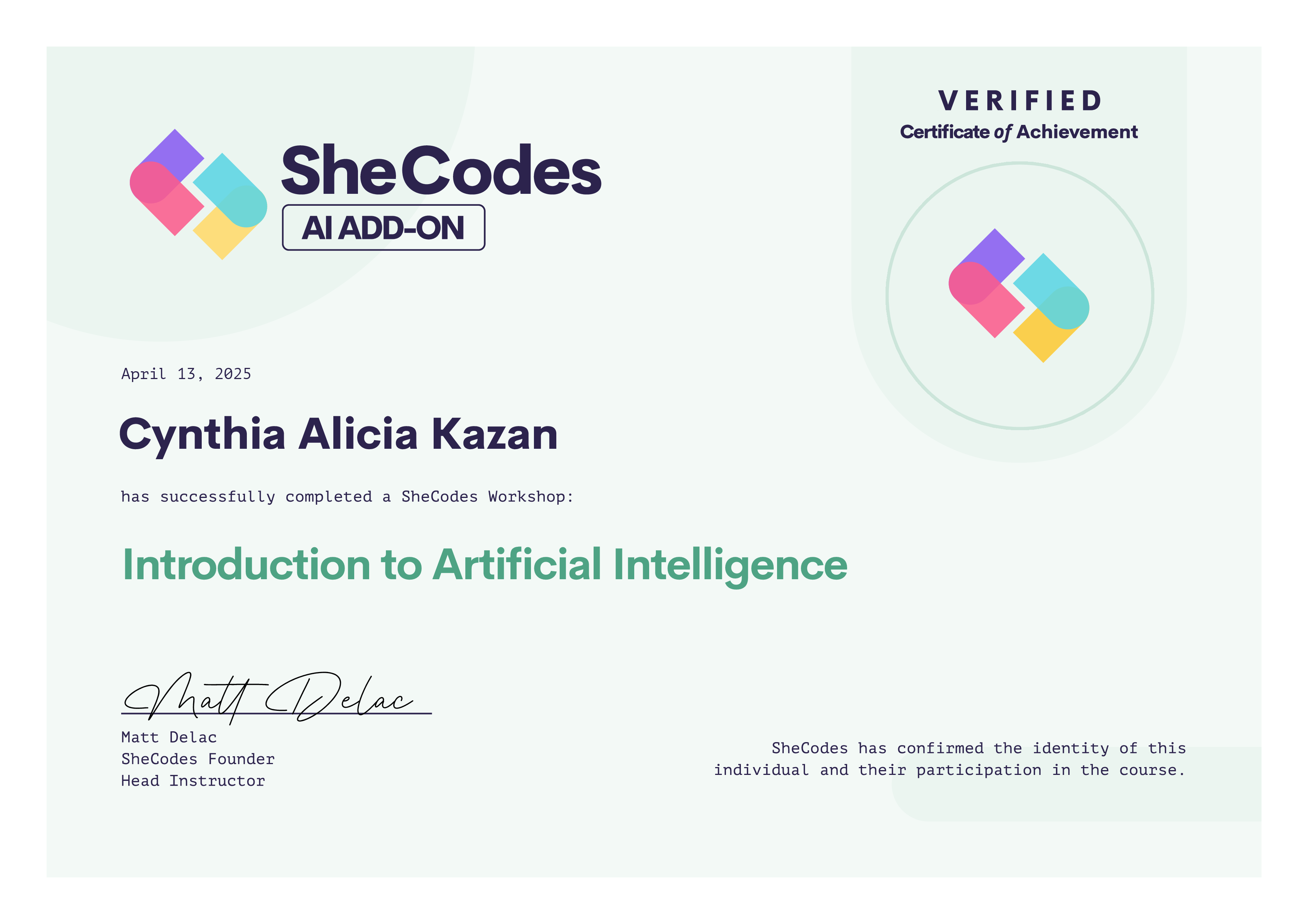 Cynthia Alicia successfully graduated from at least one SheCodes Coding Workshop and is featured in the SheCodes Hall of Fame
