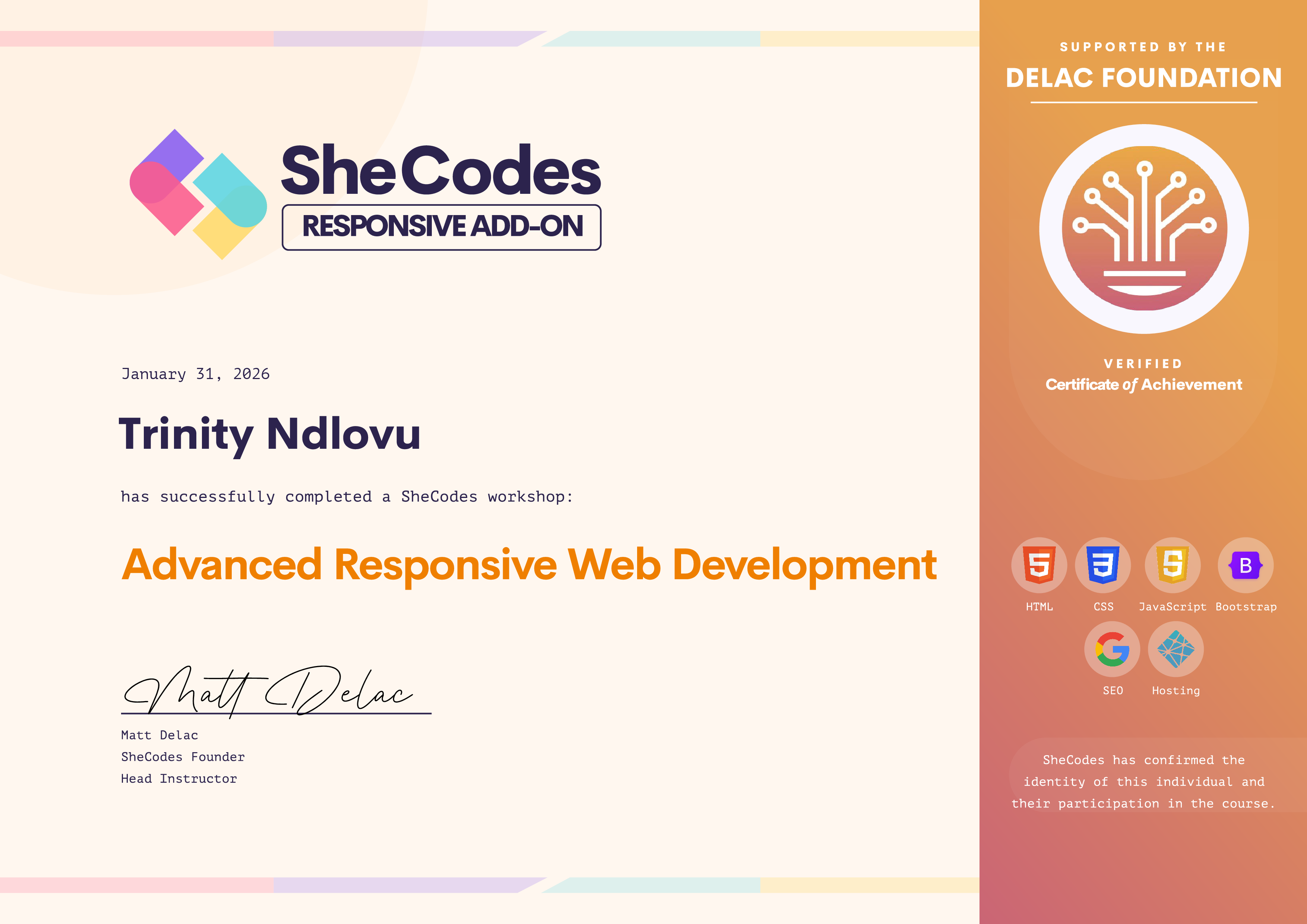 Trinity successfully graduated from at least one SheCodes Coding Workshop and is featured in the SheCodes Hall of Fame