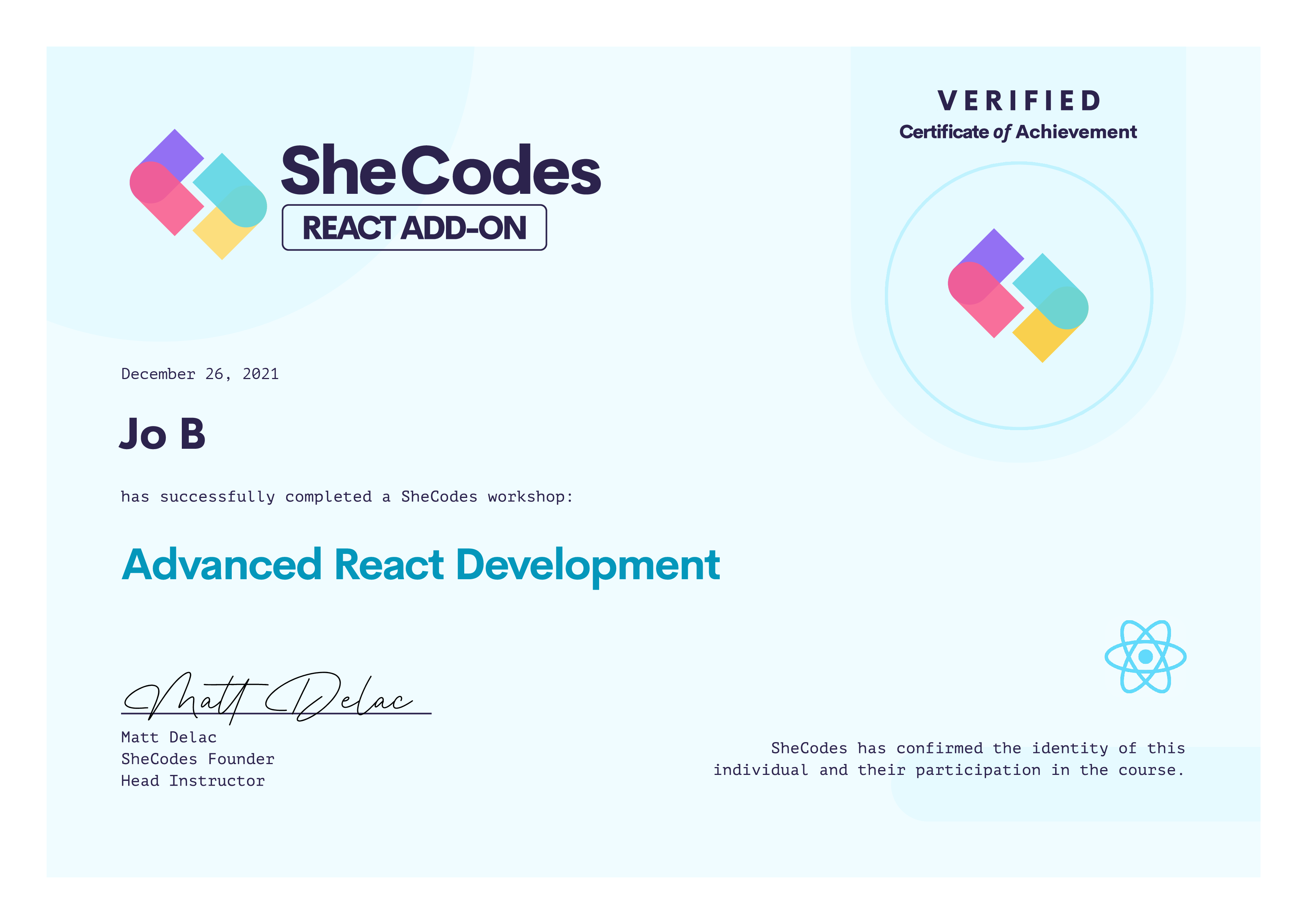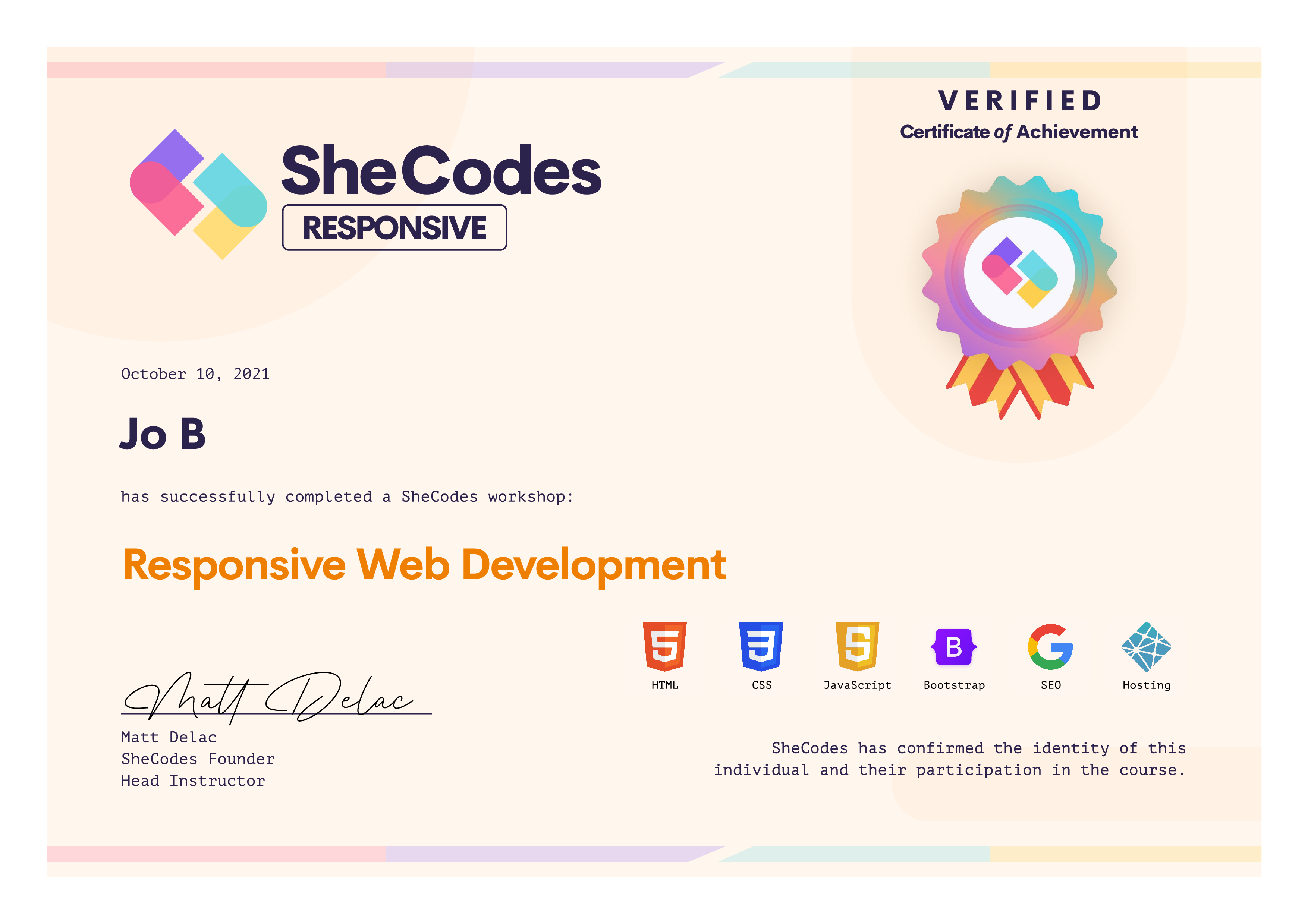 Jo successfully graduated from at least one SheCodes Coding Workshop and is featured in the SheCodes Hall of Fame