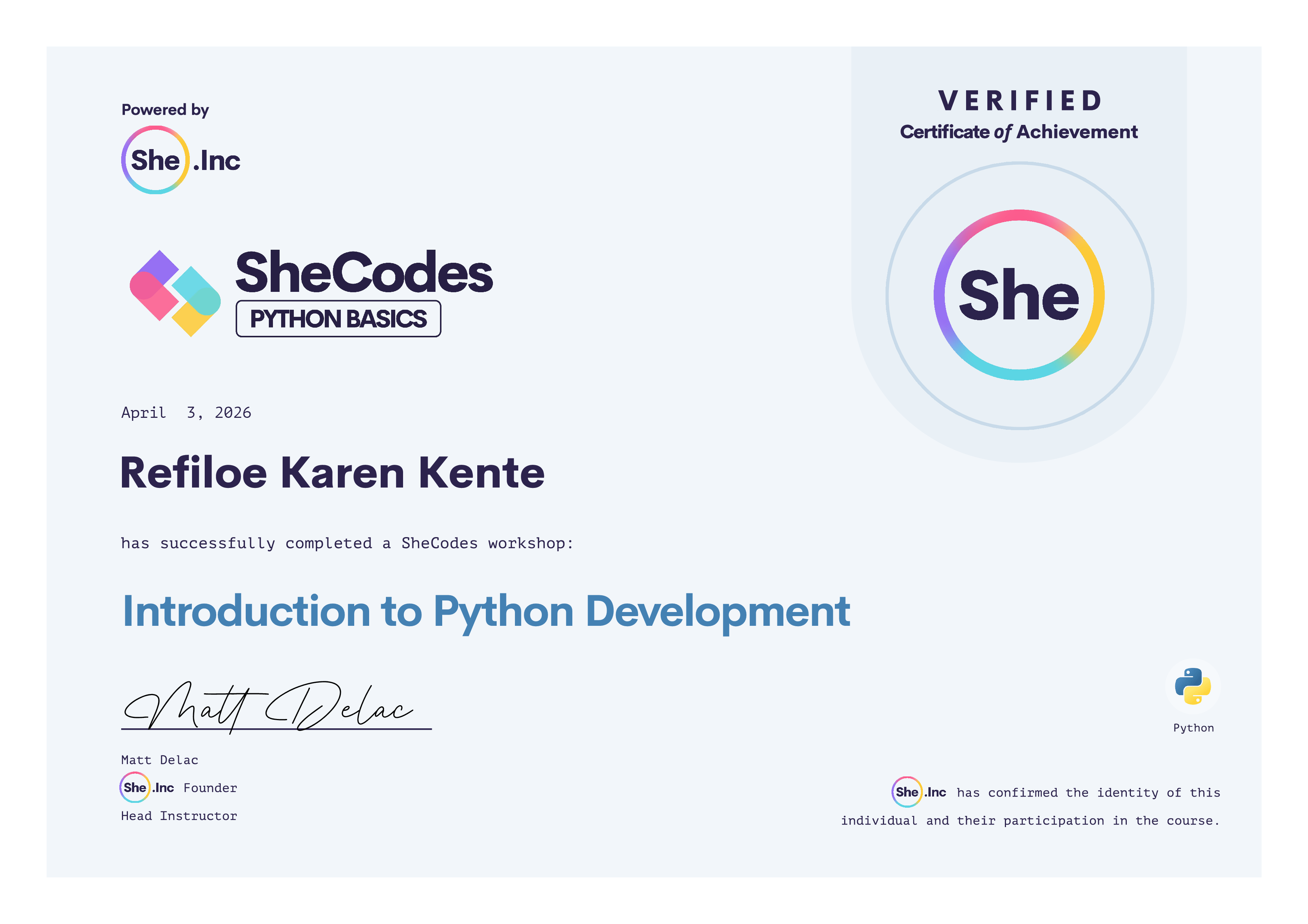 Refiloe Karen successfully graduated from at least one SheCodes Coding Workshop and is featured in the SheCodes Hall of Fame
