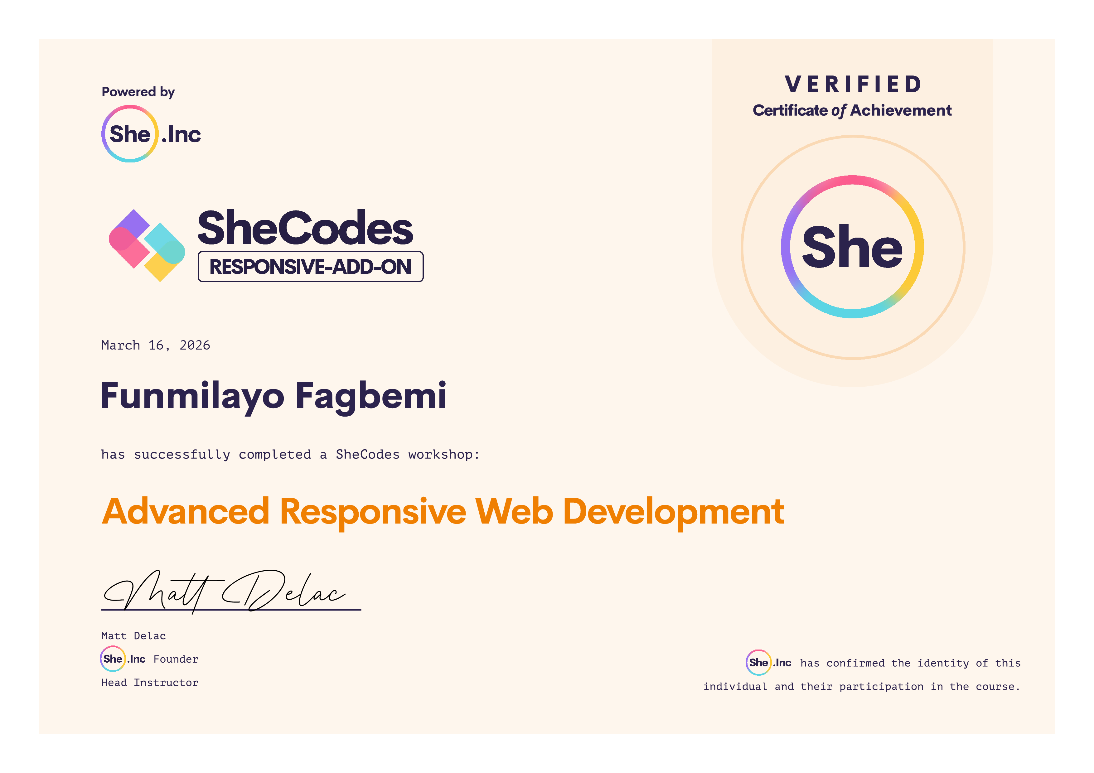 Funmilayo successfully graduated from at least one SheCodes Coding Workshop and is featured in the SheCodes Hall of Fame