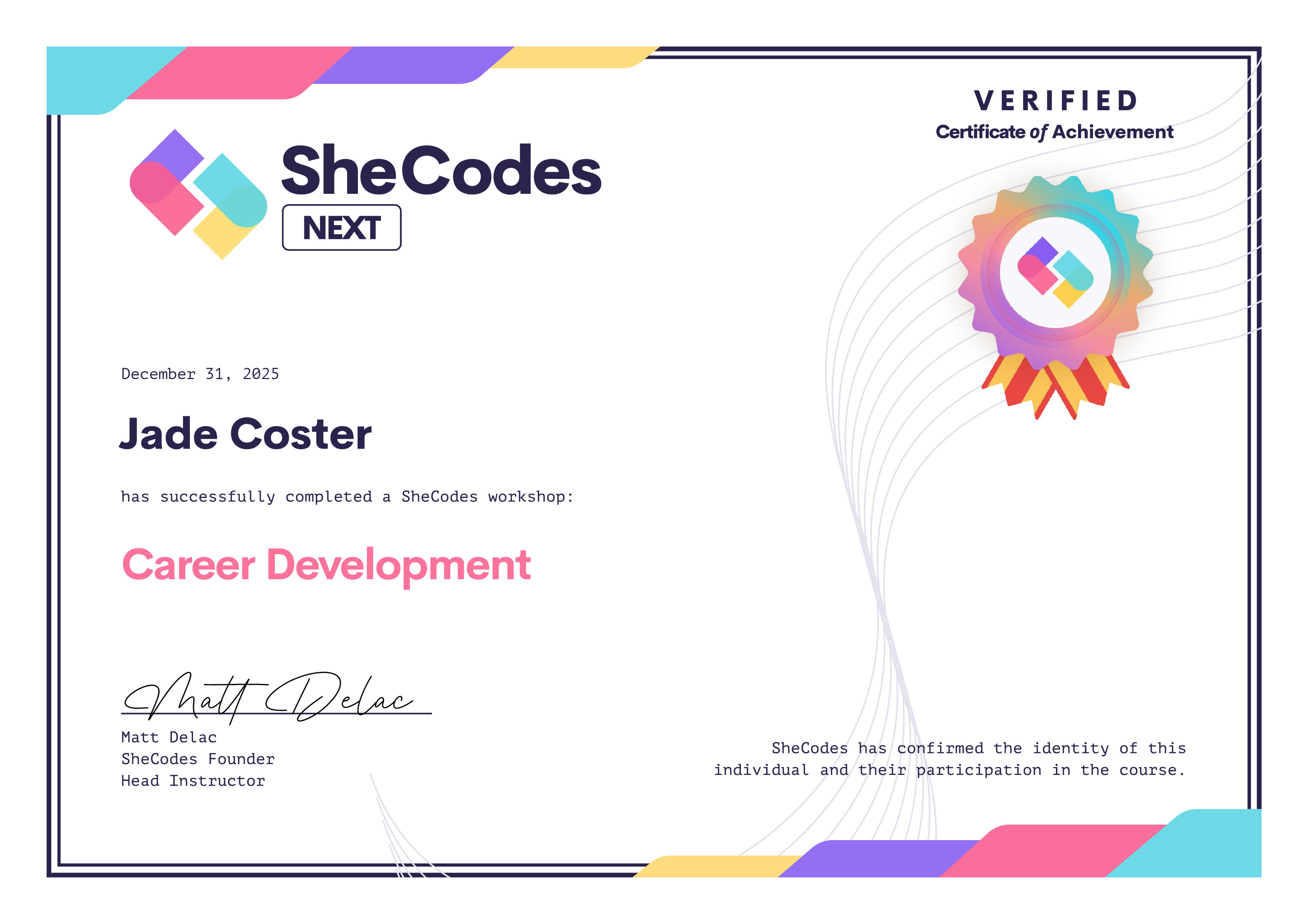 Jade successfully graduated from at least one SheCodes Coding Workshop and is featured in the SheCodes Hall of Fame