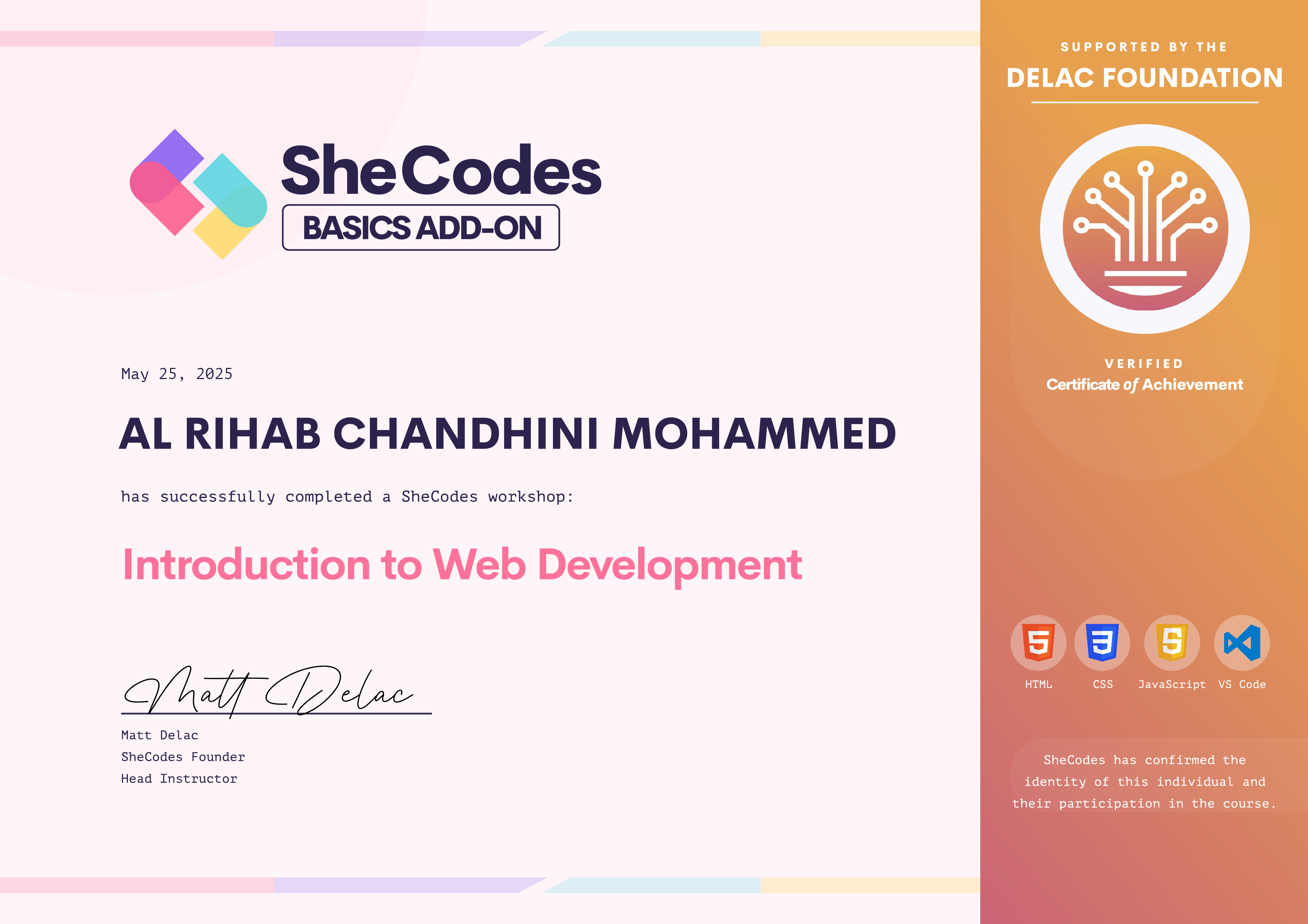 AL RIHAB CHANDHINI has been fully supported by the Delac Foundation to complete this SheCodes Workshop