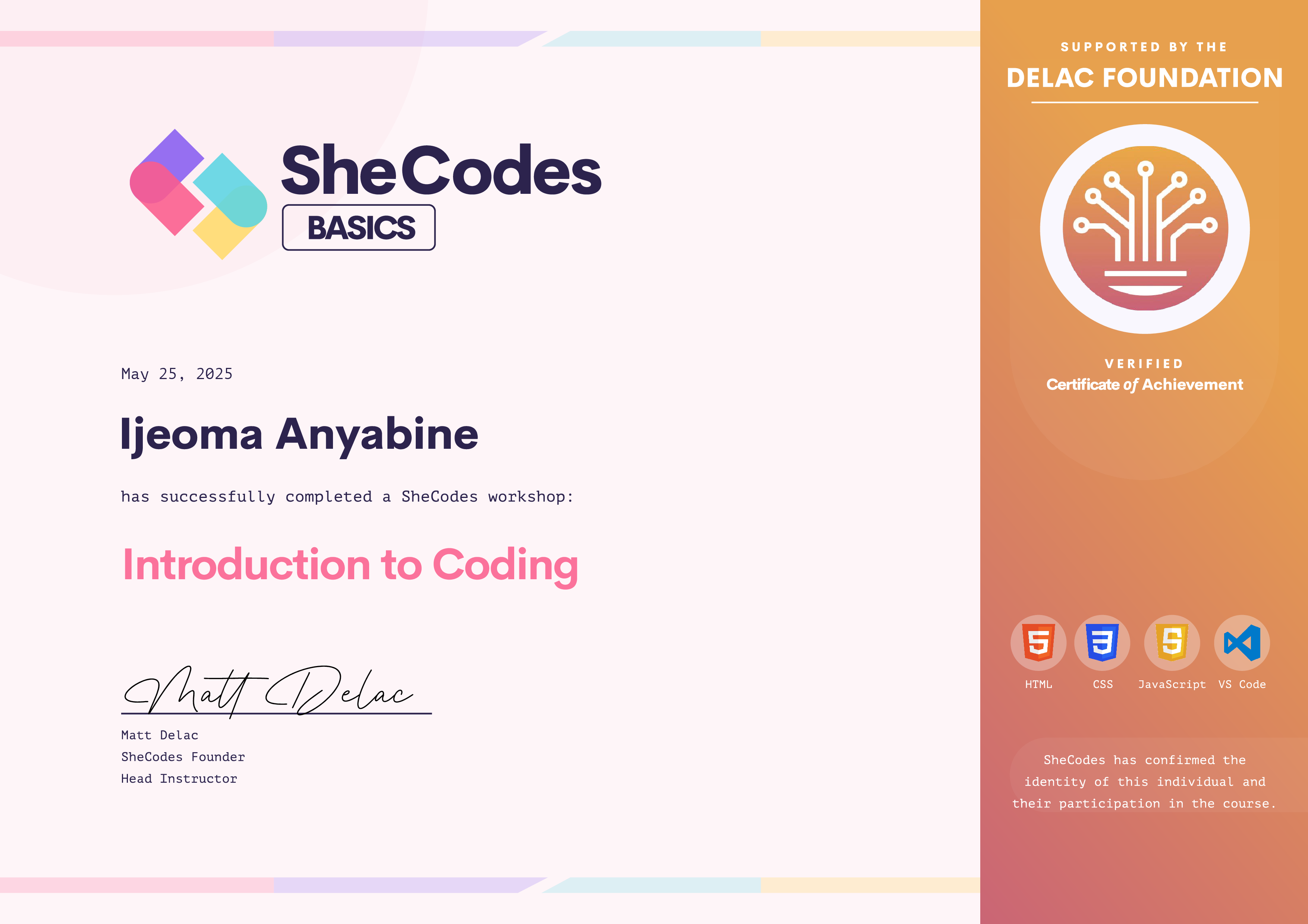 Ijeoma has been fully supported by the Delac Foundation to complete this SheCodes Workshop
