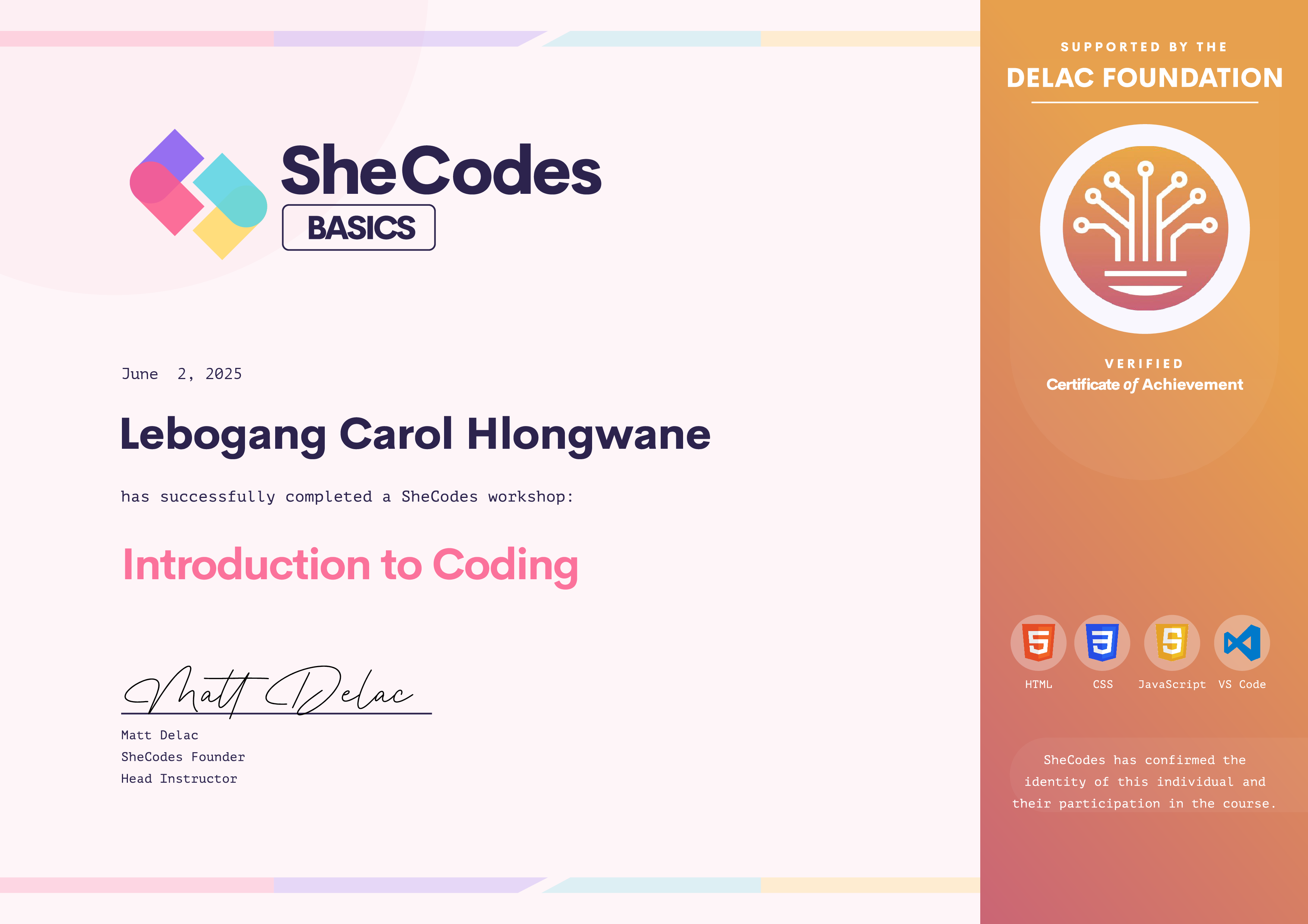 Lebogang Carol has been fully supported by the Delac Foundation to complete this SheCodes Workshop