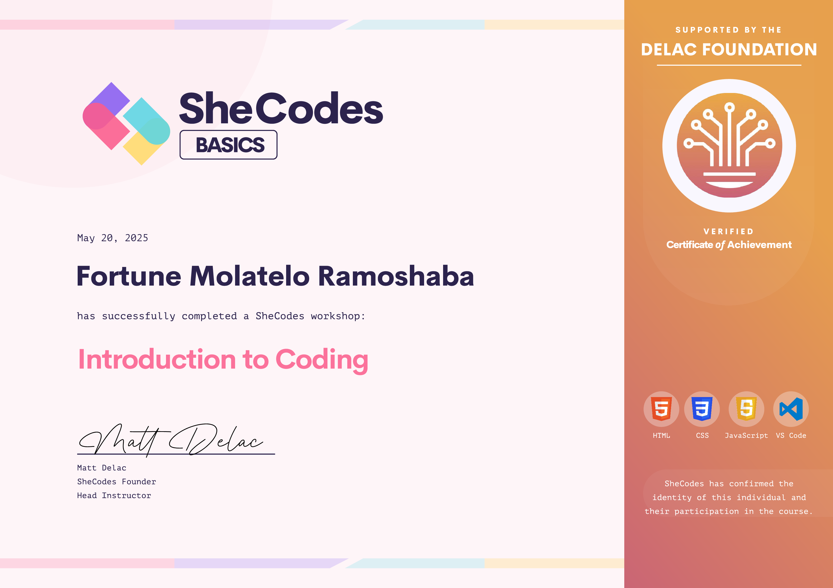 Fortune Molatelo has been fully supported by the Delac Foundation to complete this SheCodes Workshop