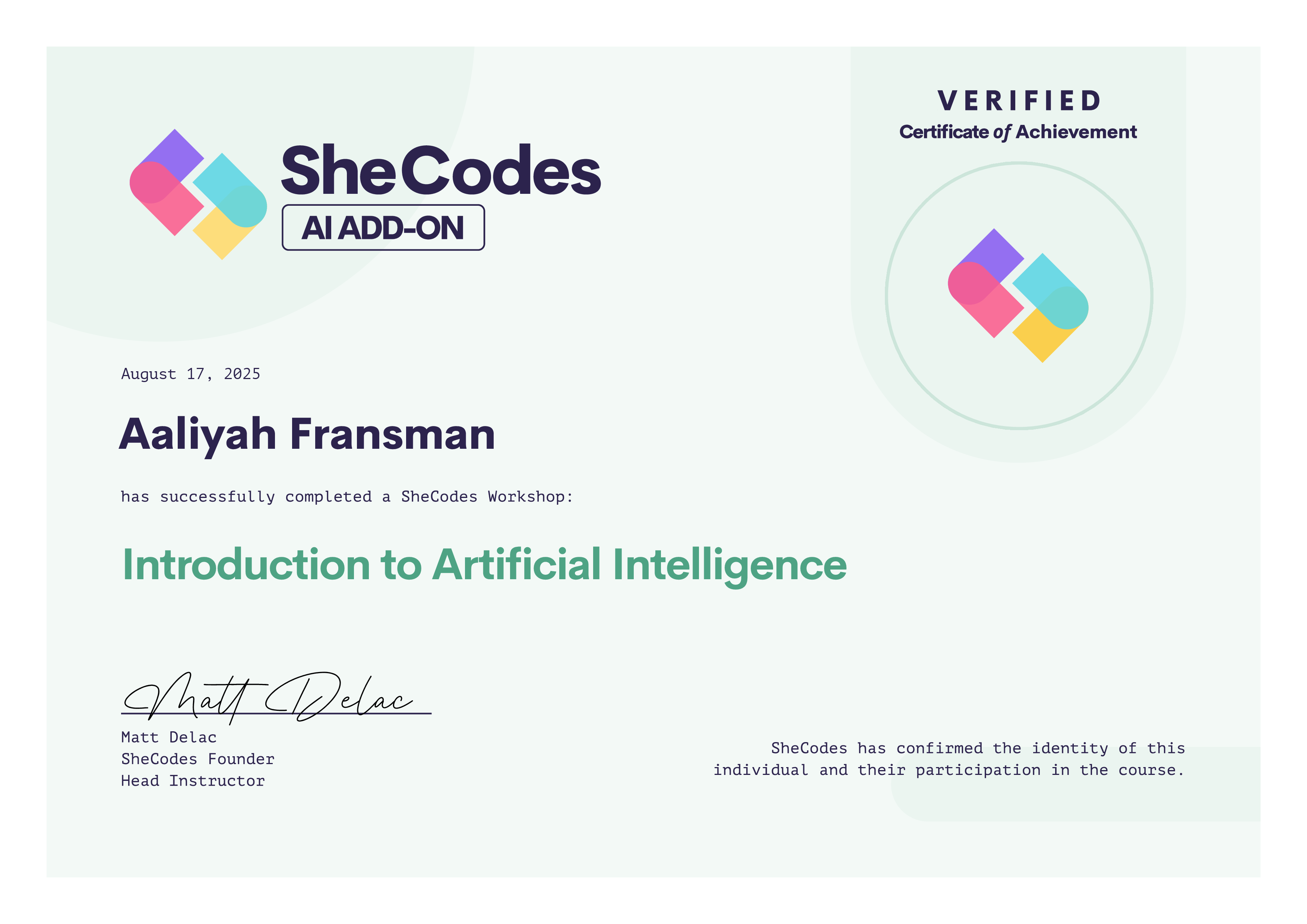 Aaliyah Fransman SheCodes Profile | SheCodes