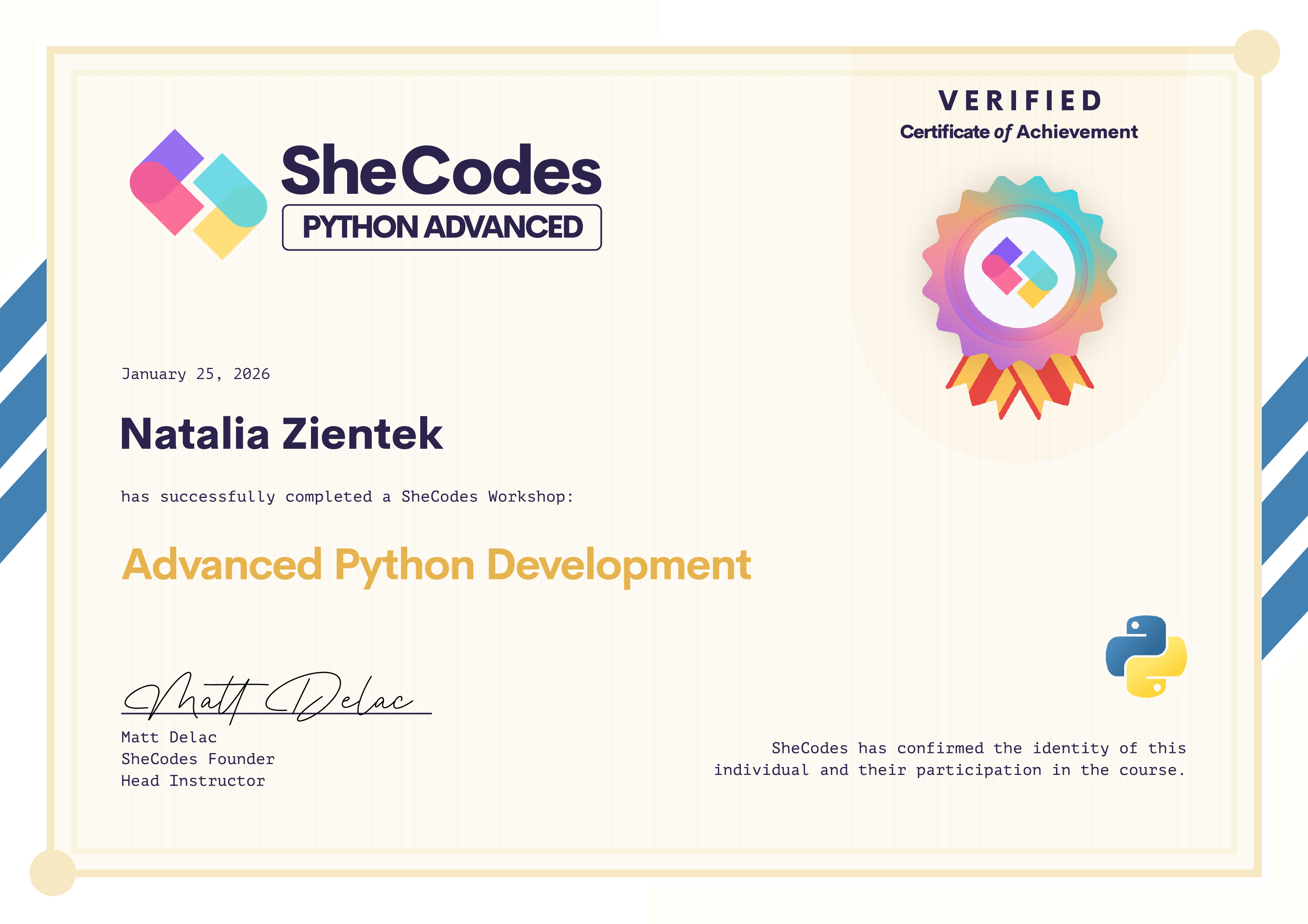 Natalia successfully graduated from at least one SheCodes Coding Workshop and is featured in the SheCodes Hall of Fame