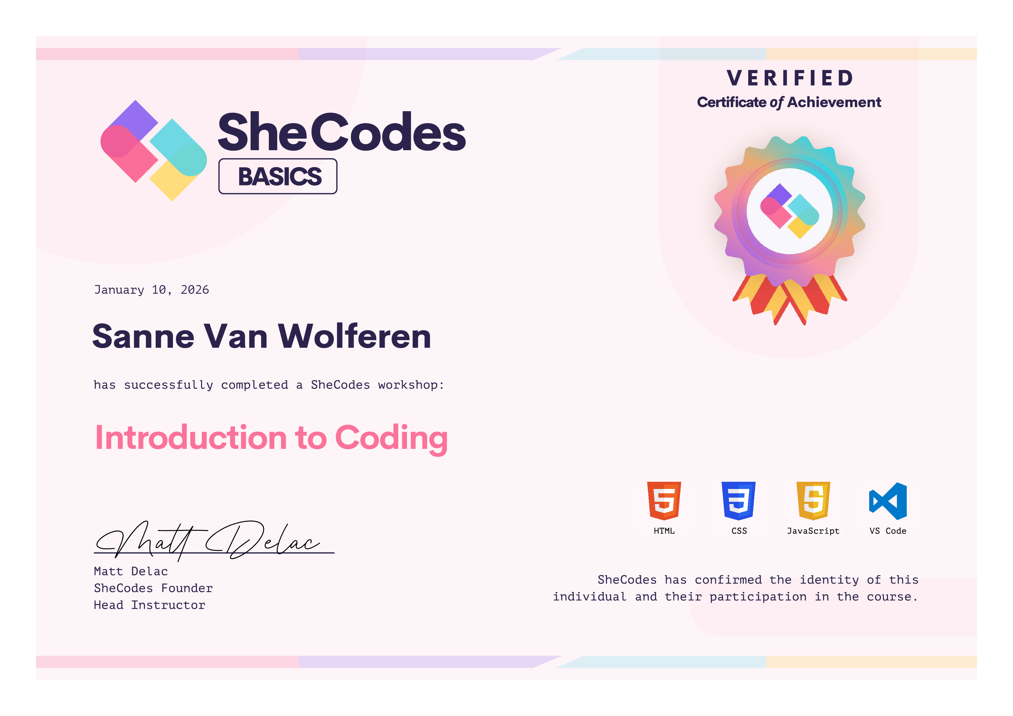 Sanne successfully graduated from at least one SheCodes Coding Workshop and is featured in the SheCodes Hall of Fame
