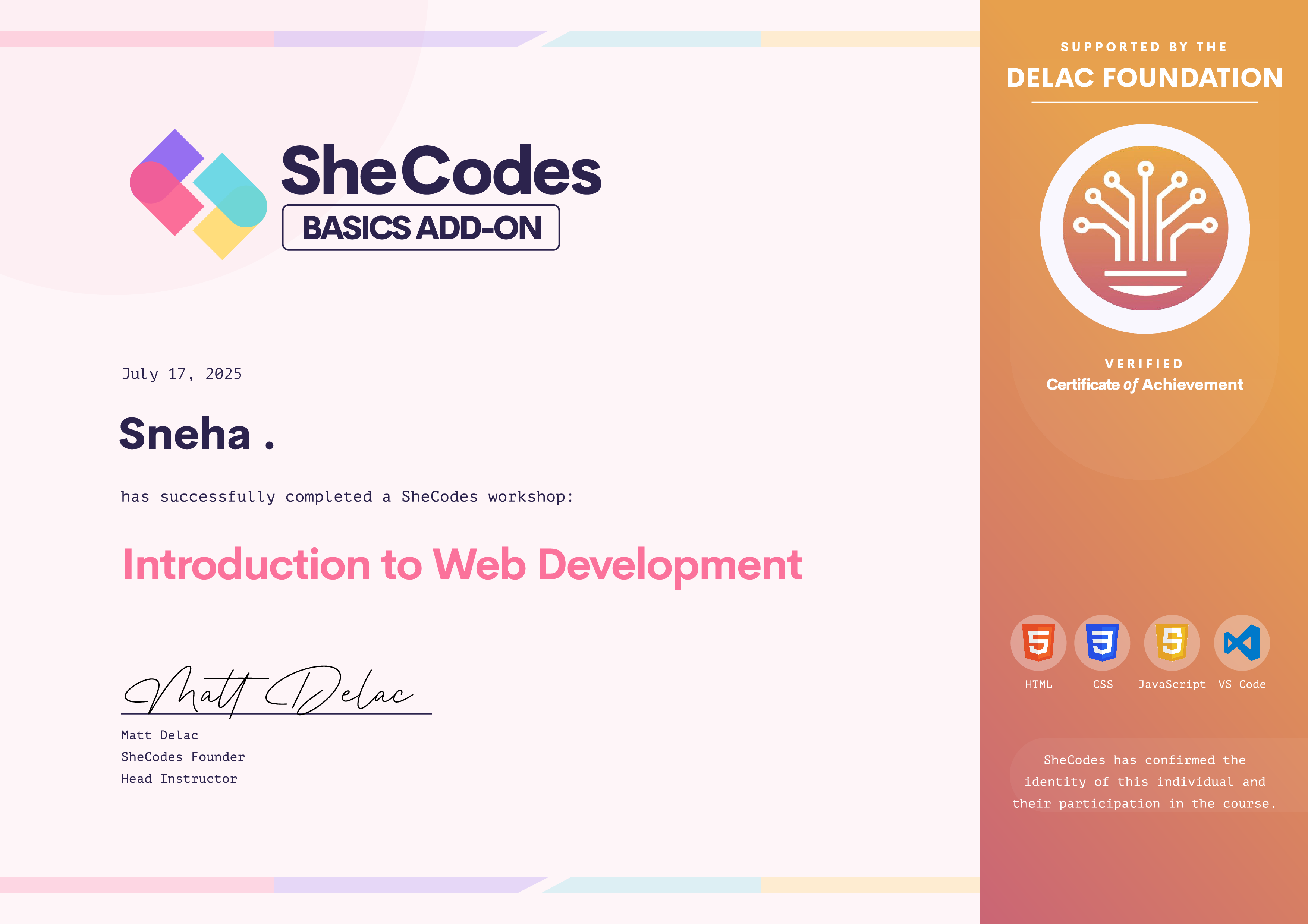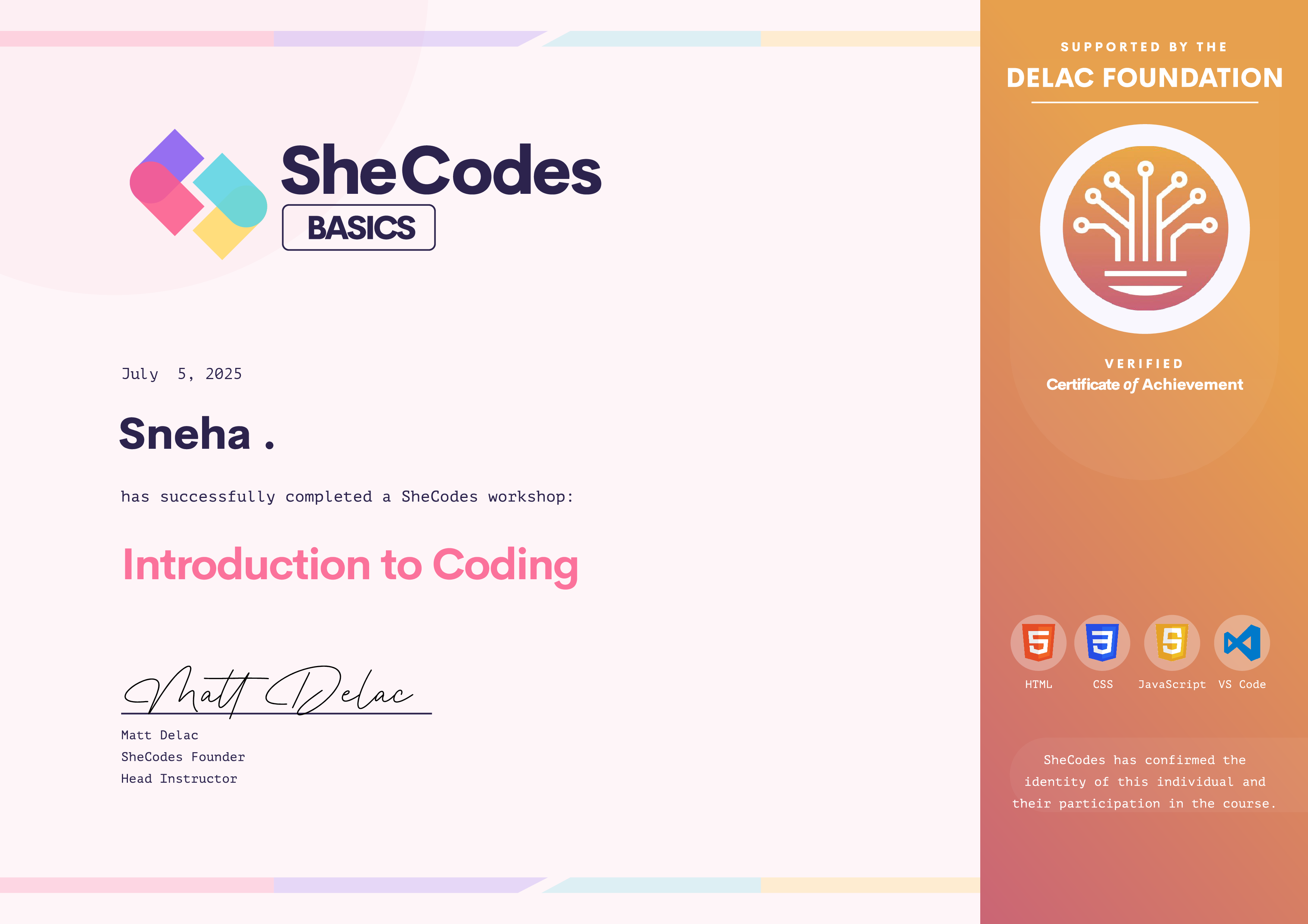 Sneha has been fully supported by the Delac Foundation to complete this SheCodes Workshop