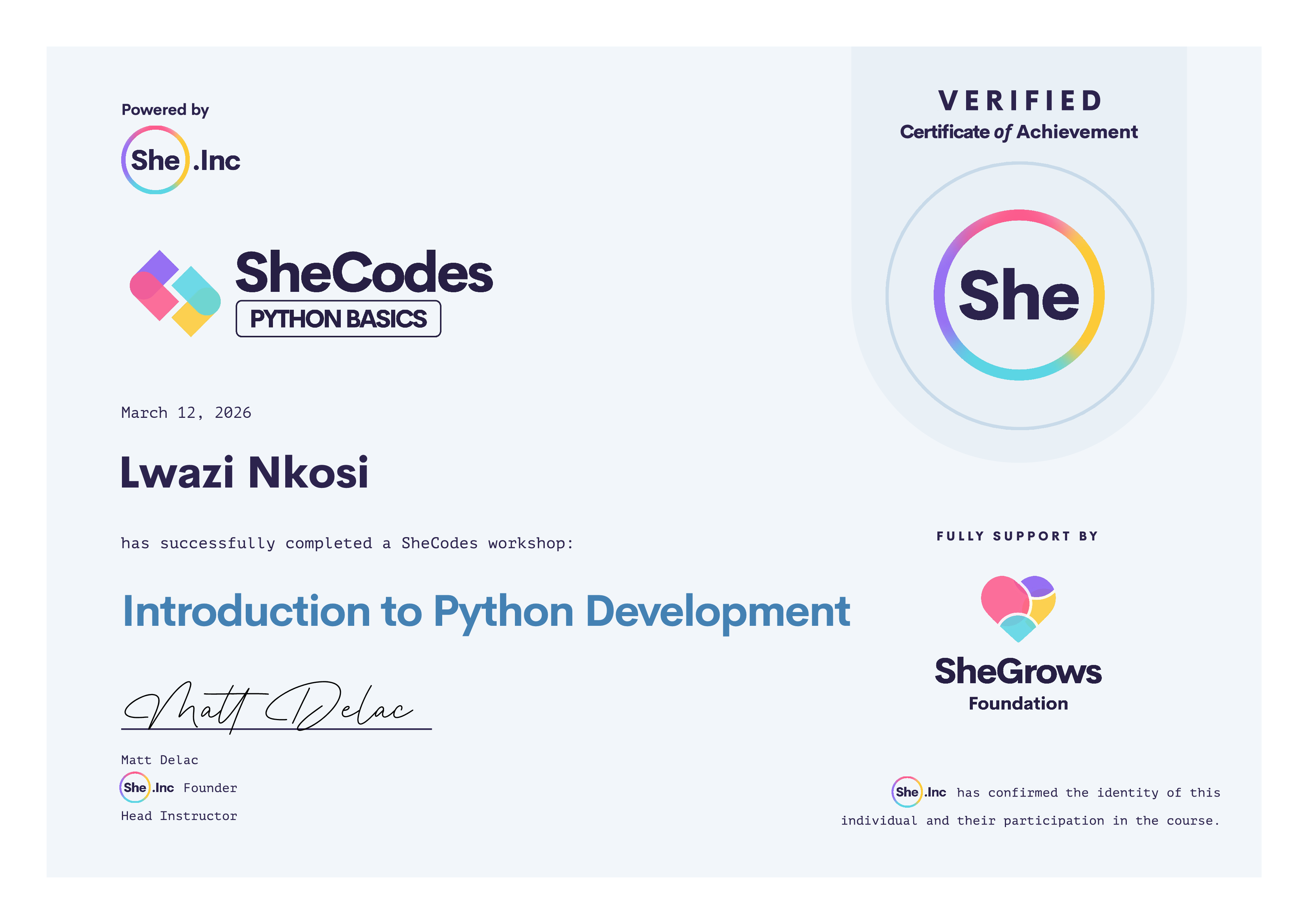 Lwazi has been fully supported by the The SheGrows Foundation to complete this SheCodes Workshop