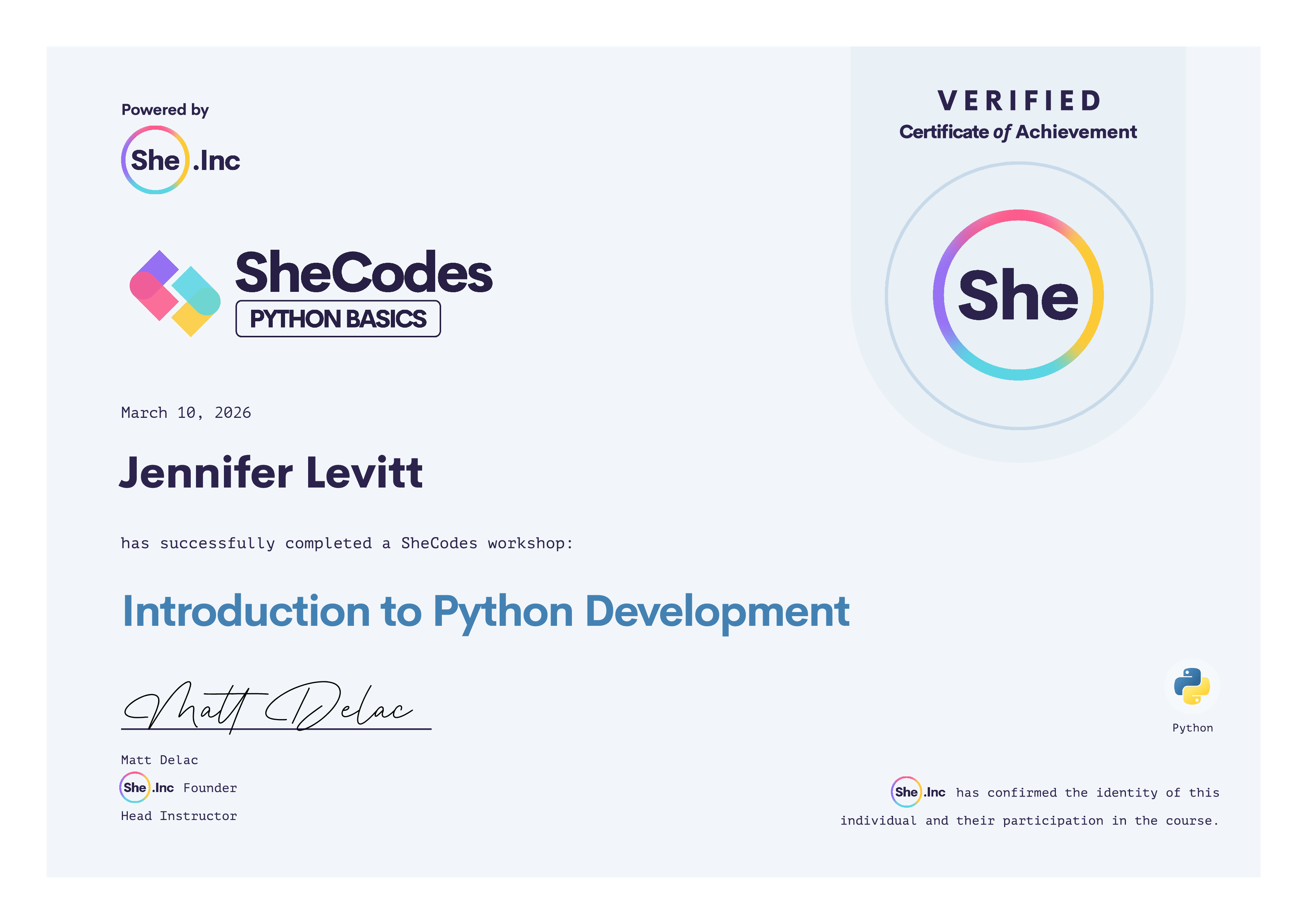 Jennifer successfully graduated from at least one SheCodes Coding Workshop and is featured in the SheCodes Hall of Fame
