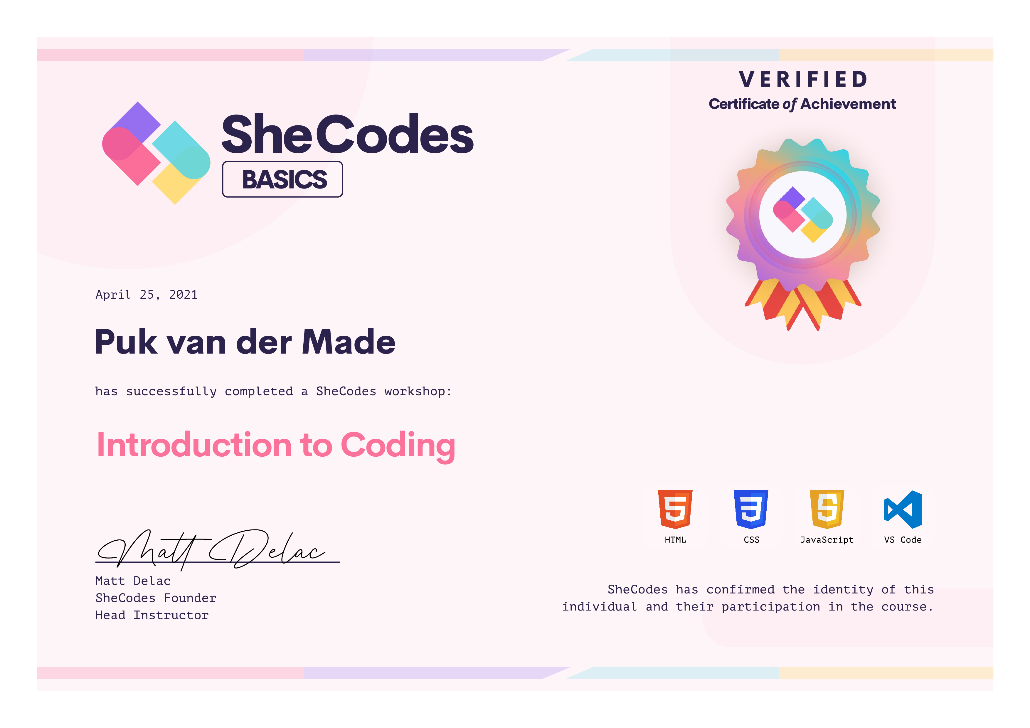 Puk successfully graduated from at least one SheCodes Coding Workshop and is featured in the SheCodes Hall of Fame