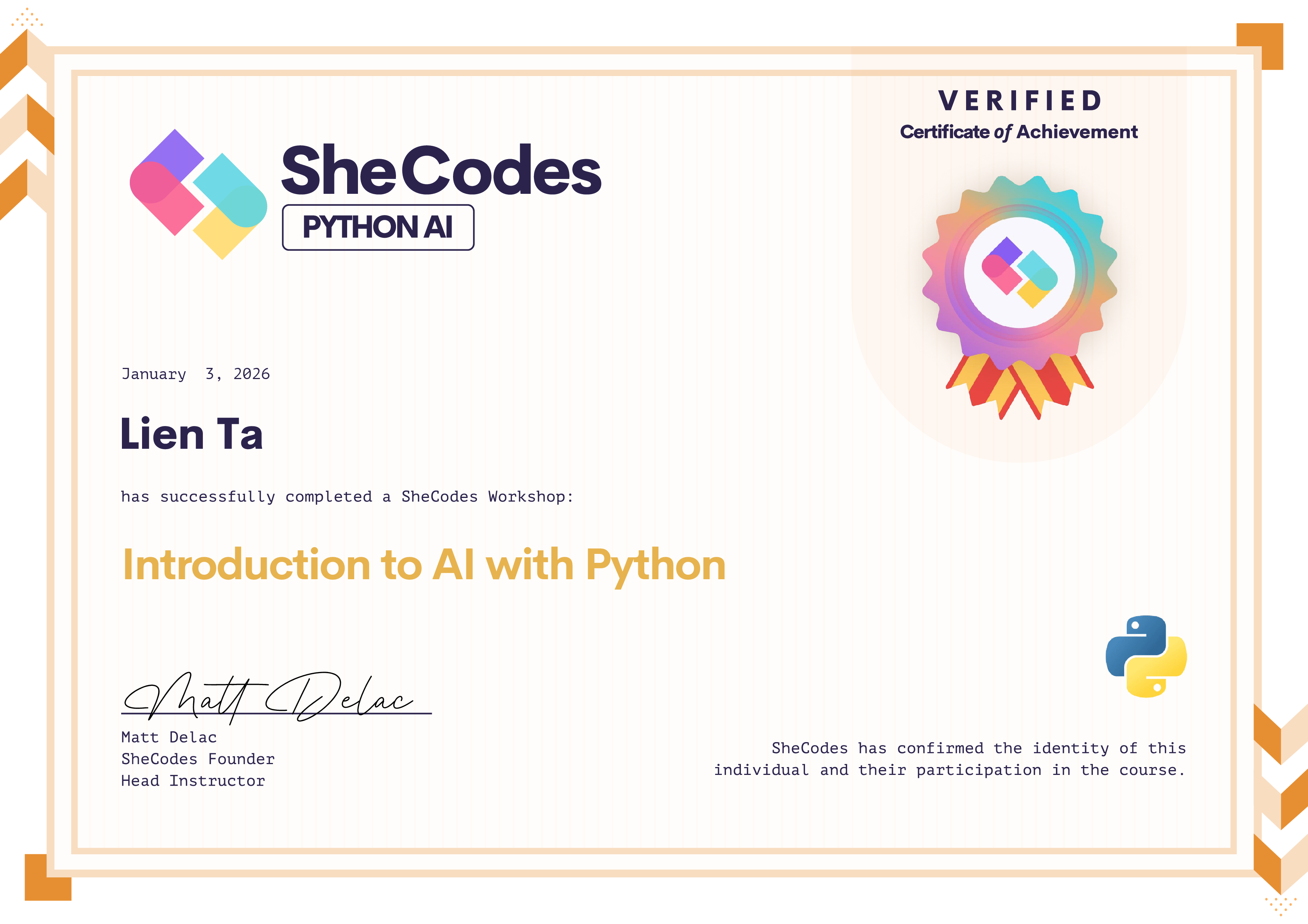 Lien successfully graduated from at least one SheCodes Coding Workshop and is featured in the SheCodes Hall of Fame