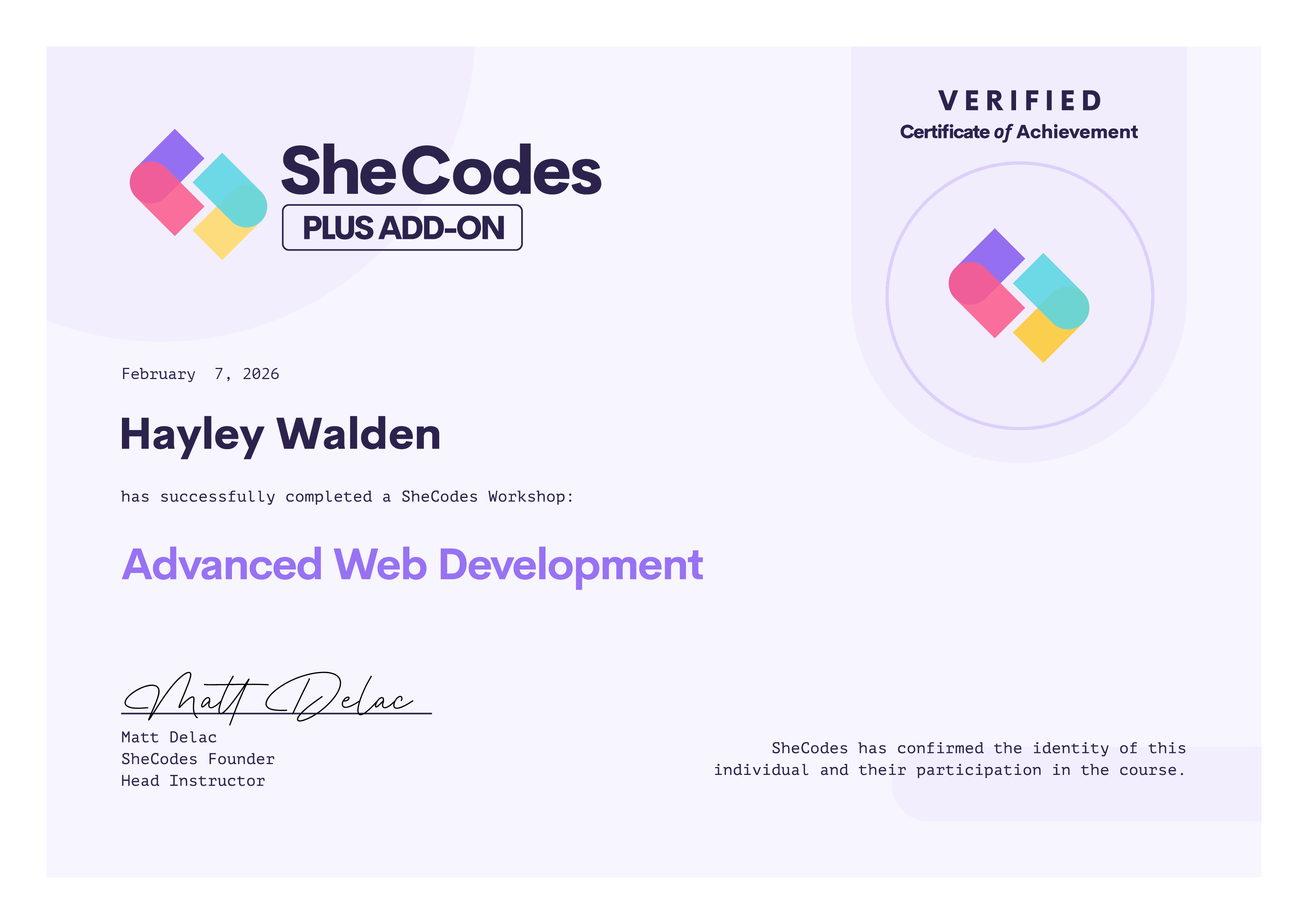 Hayley successfully graduated from at least one SheCodes Coding Workshop and is featured in the SheCodes Hall of Fame