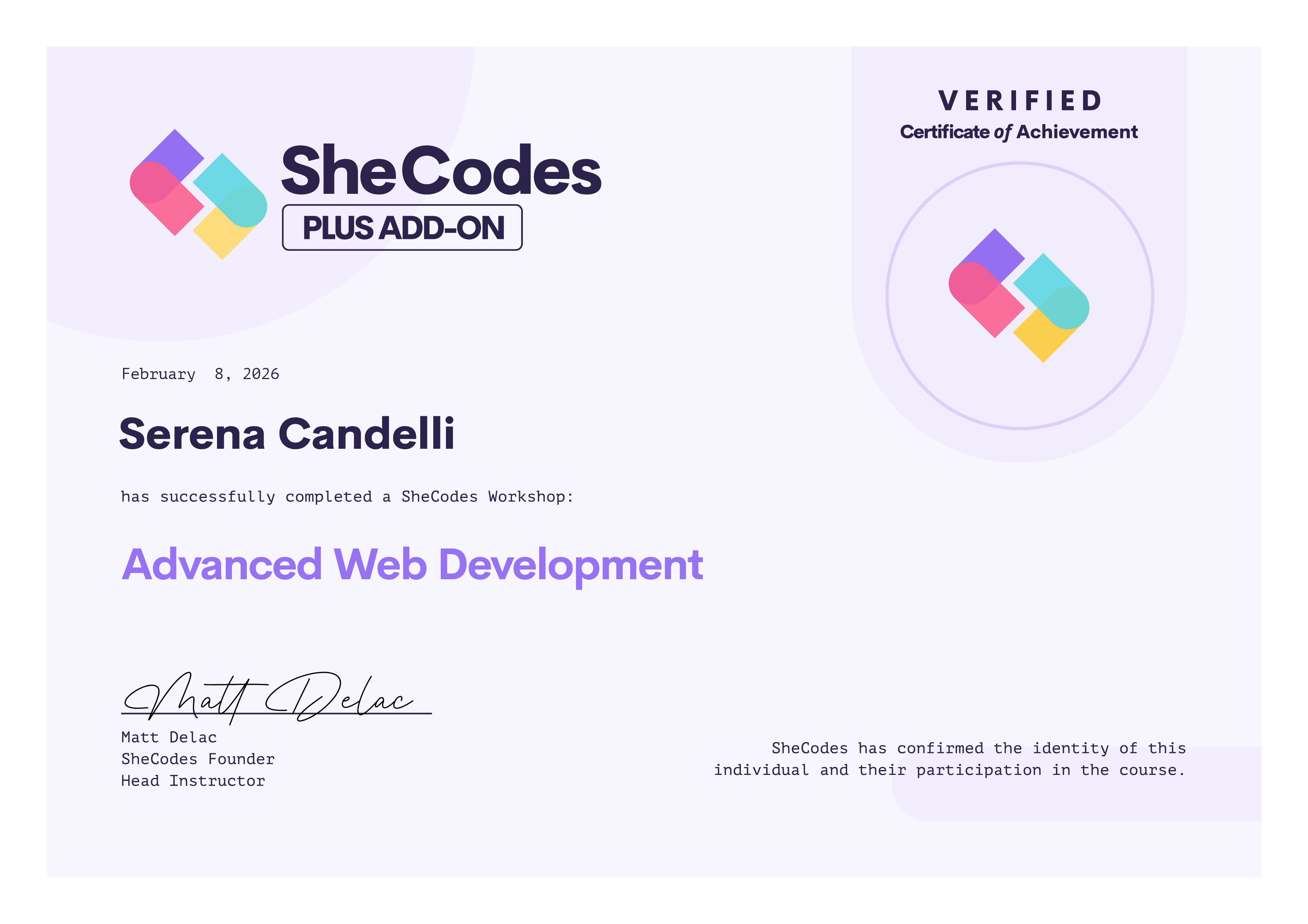 Serena successfully graduated from at least one SheCodes Coding Workshop and is featured in the SheCodes Hall of Fame