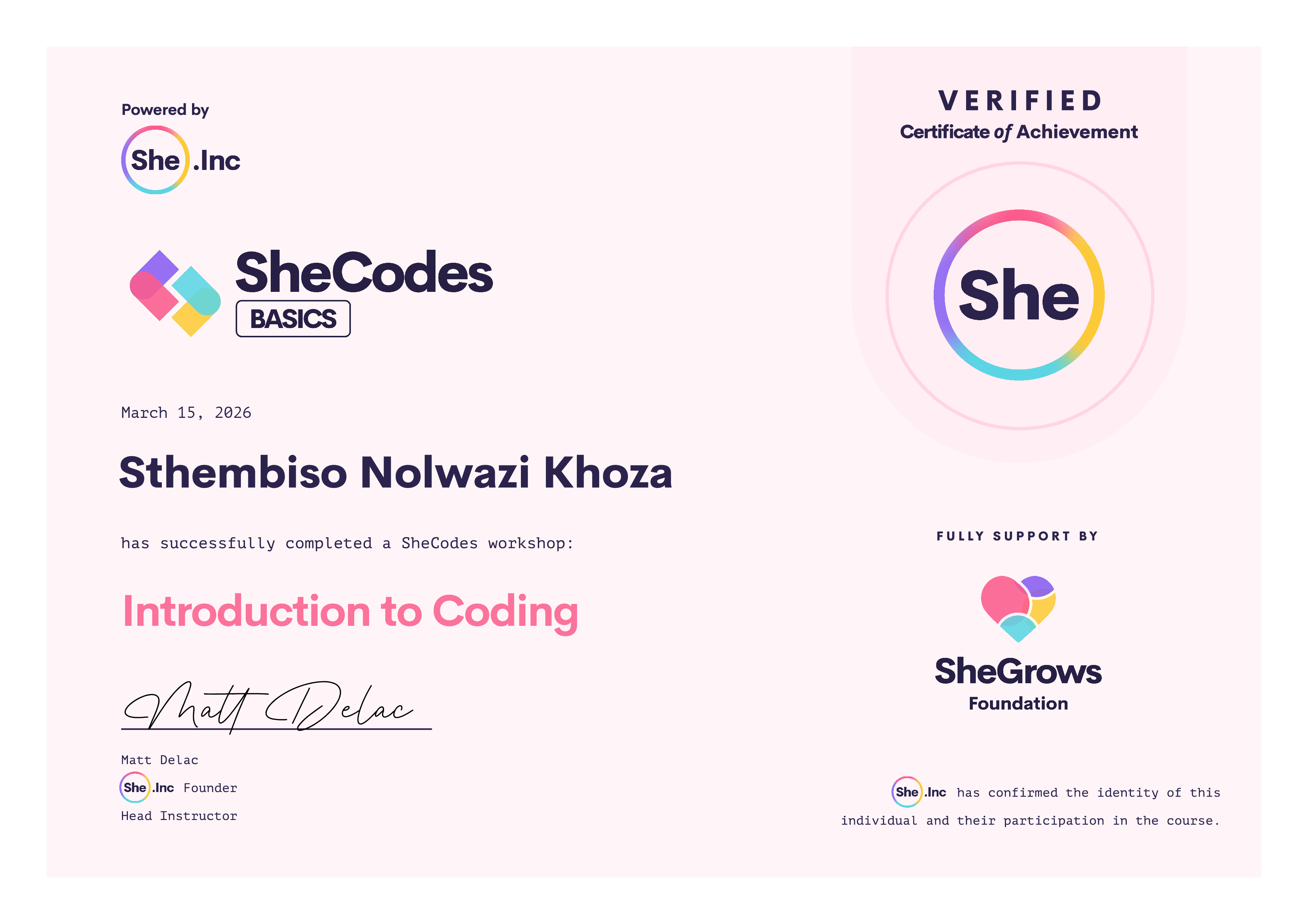 Sthembiso Nolwazi has been fully supported by the The SheDreams Foundation to complete this SheCodes Workshop