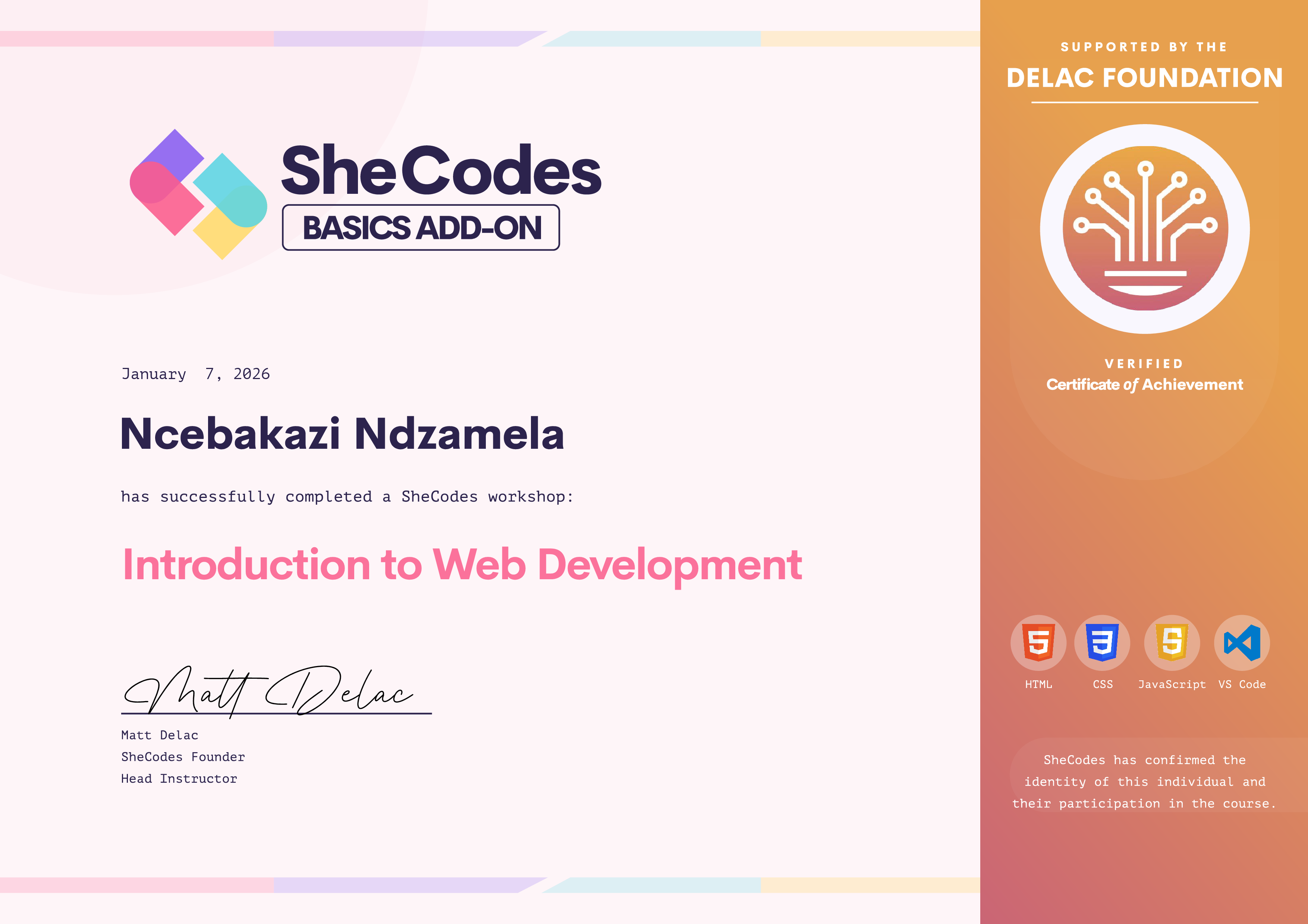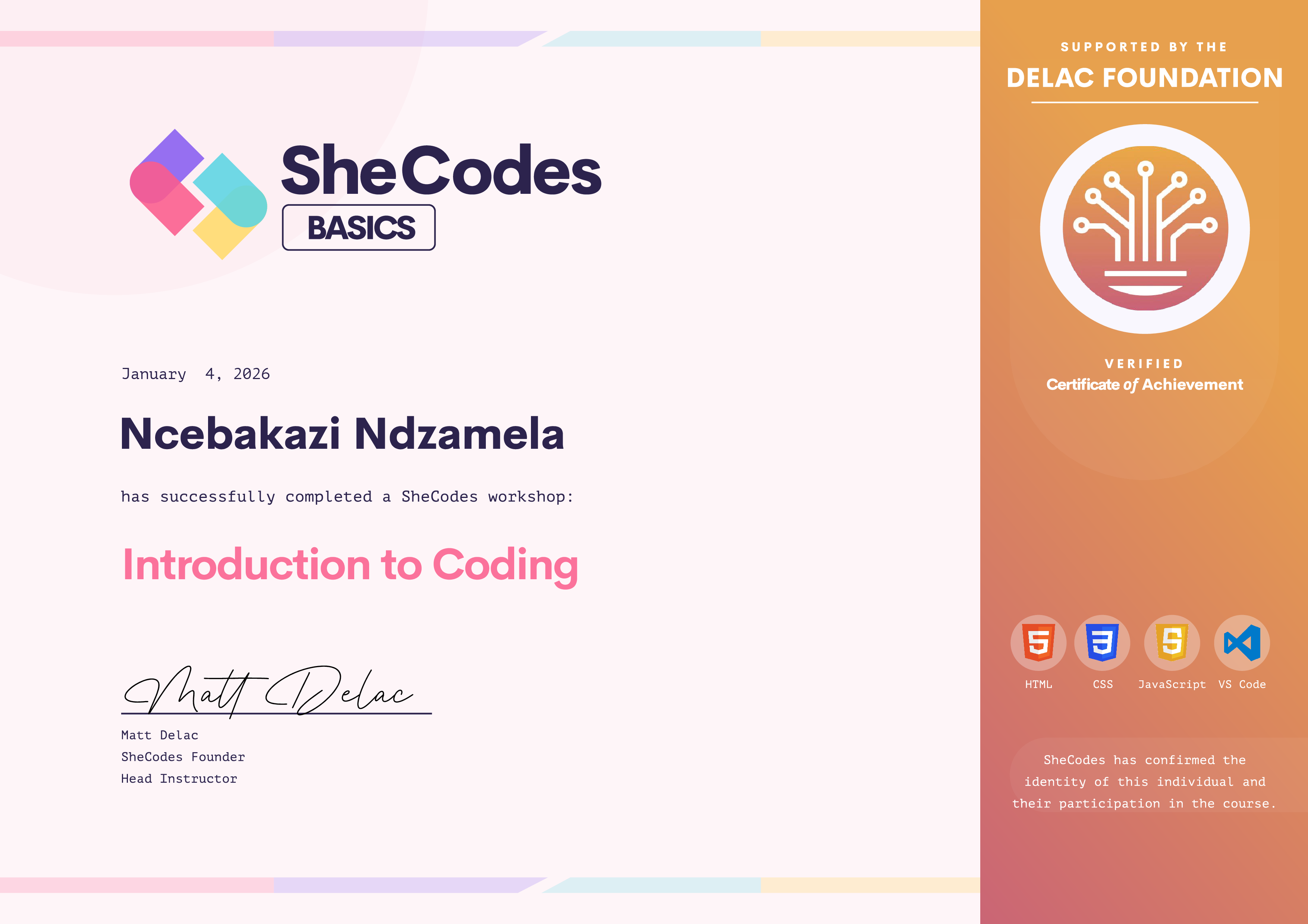 Ncebakazi has been fully supported by the Delac Foundation to complete this SheCodes Workshop