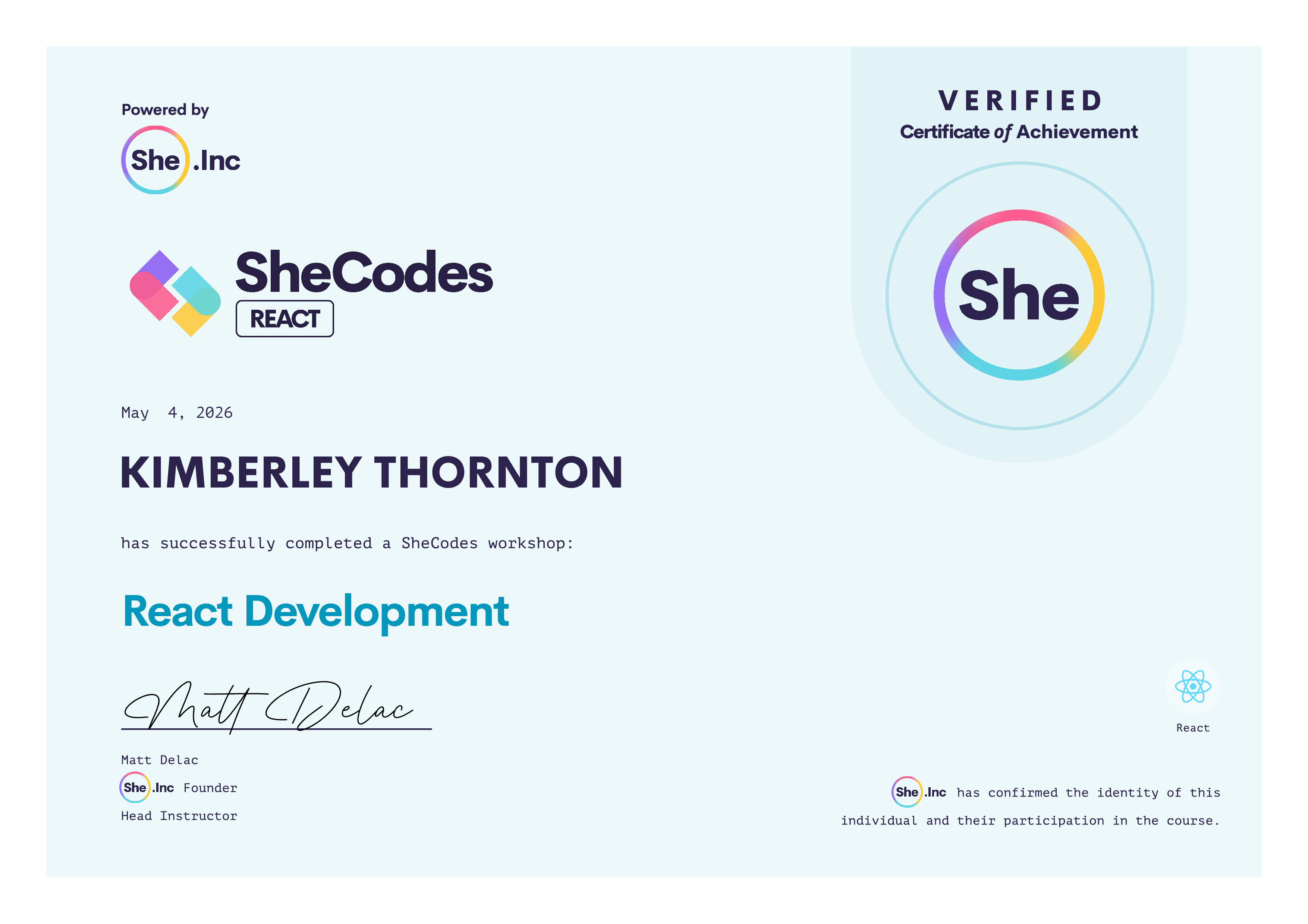 KIMBERLEY successfully graduated from at least one SheCodes Coding Workshop and is featured in the SheCodes Hall of Fame