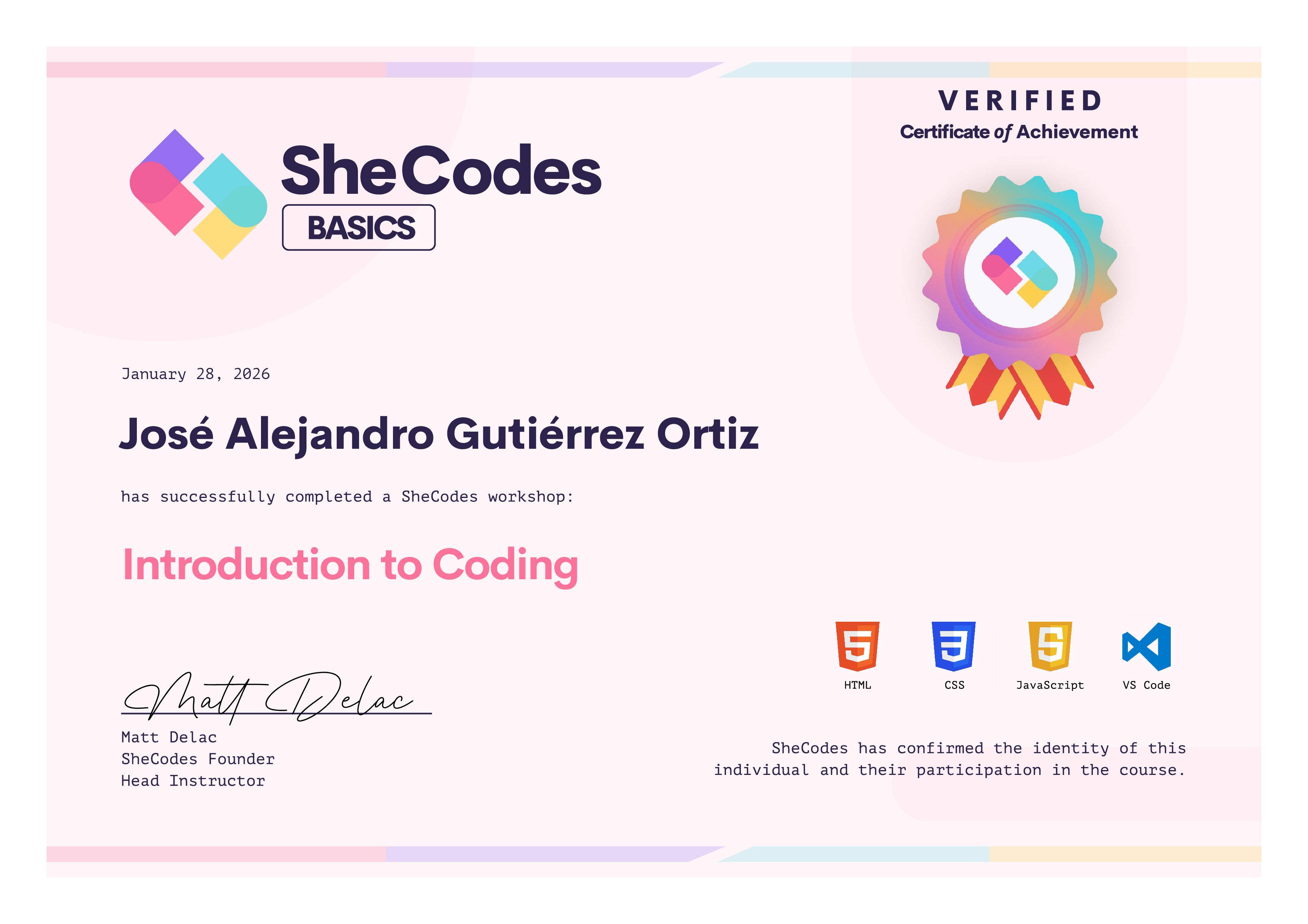 José Alejandro successfully graduated from at least one SheCodes Coding Workshop and is featured in the SheCodes Hall of Fame