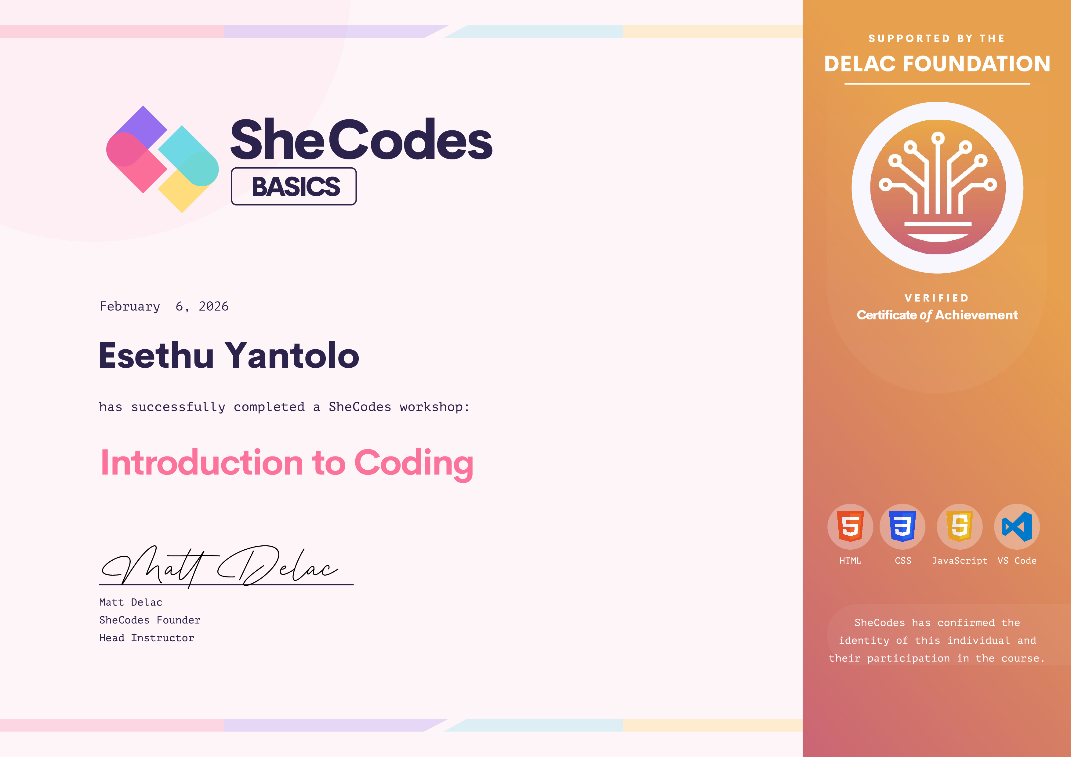 Esethu has been fully supported by the The Delac Foundation to complete this SheCodes Workshop