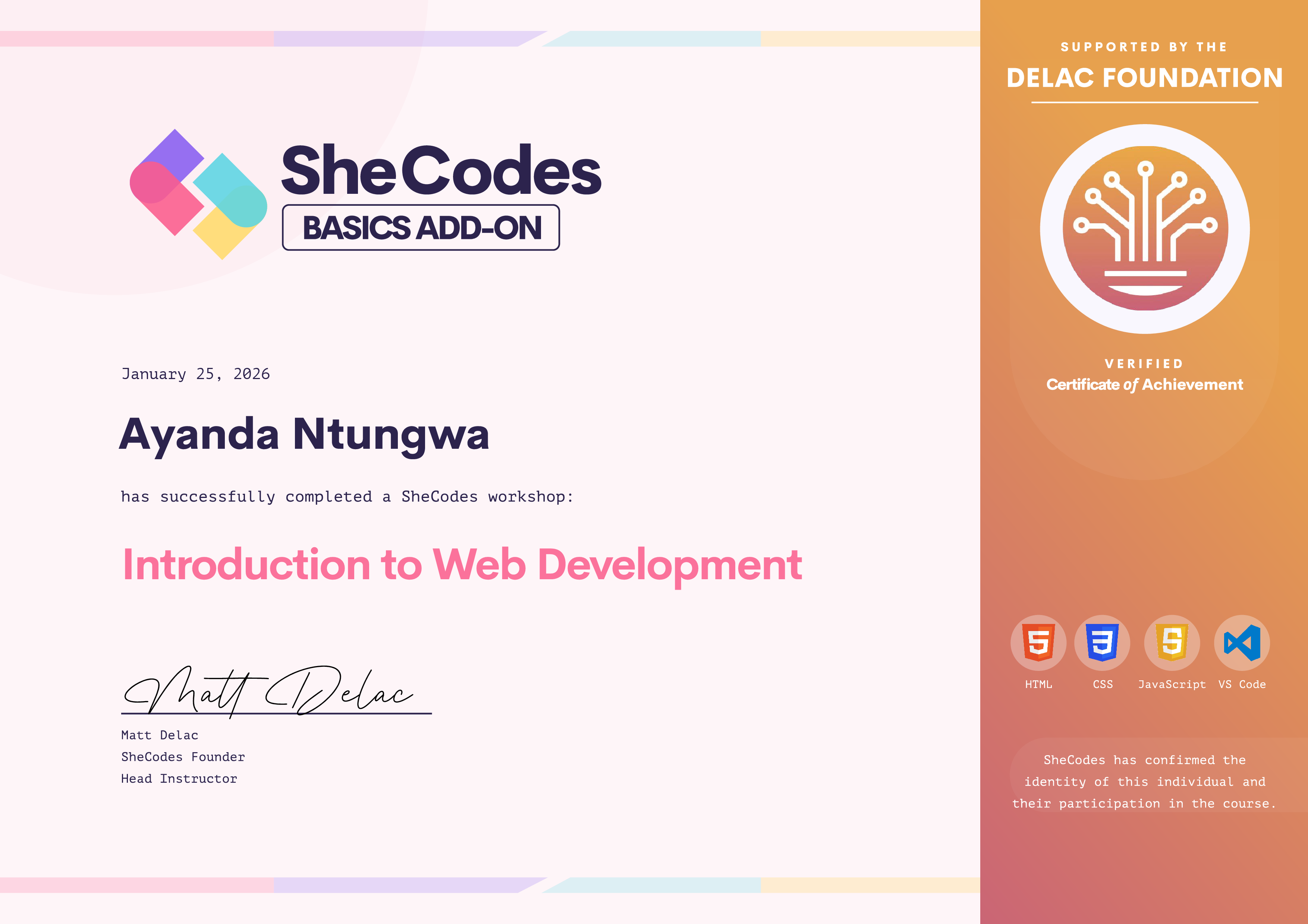 Ayanda has been fully supported by the Delac Foundation to complete this SheCodes Workshop