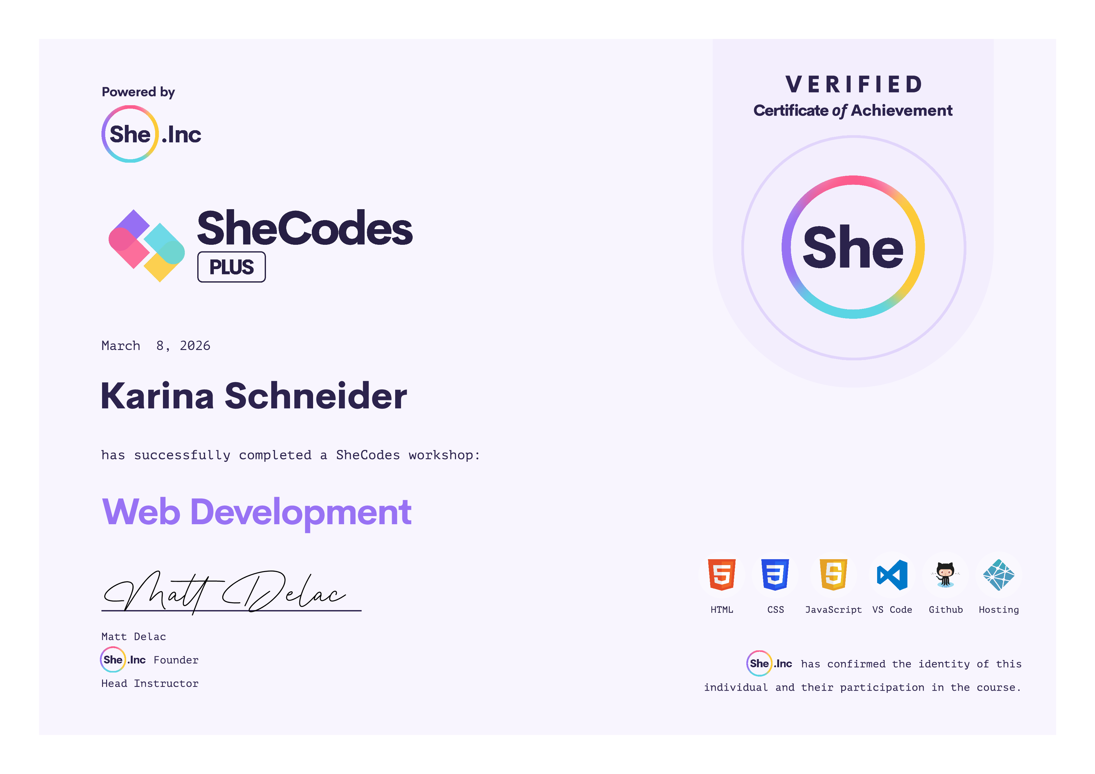 Karina successfully graduated from at least one SheCodes Coding Workshop and is featured in the SheCodes Hall of Fame