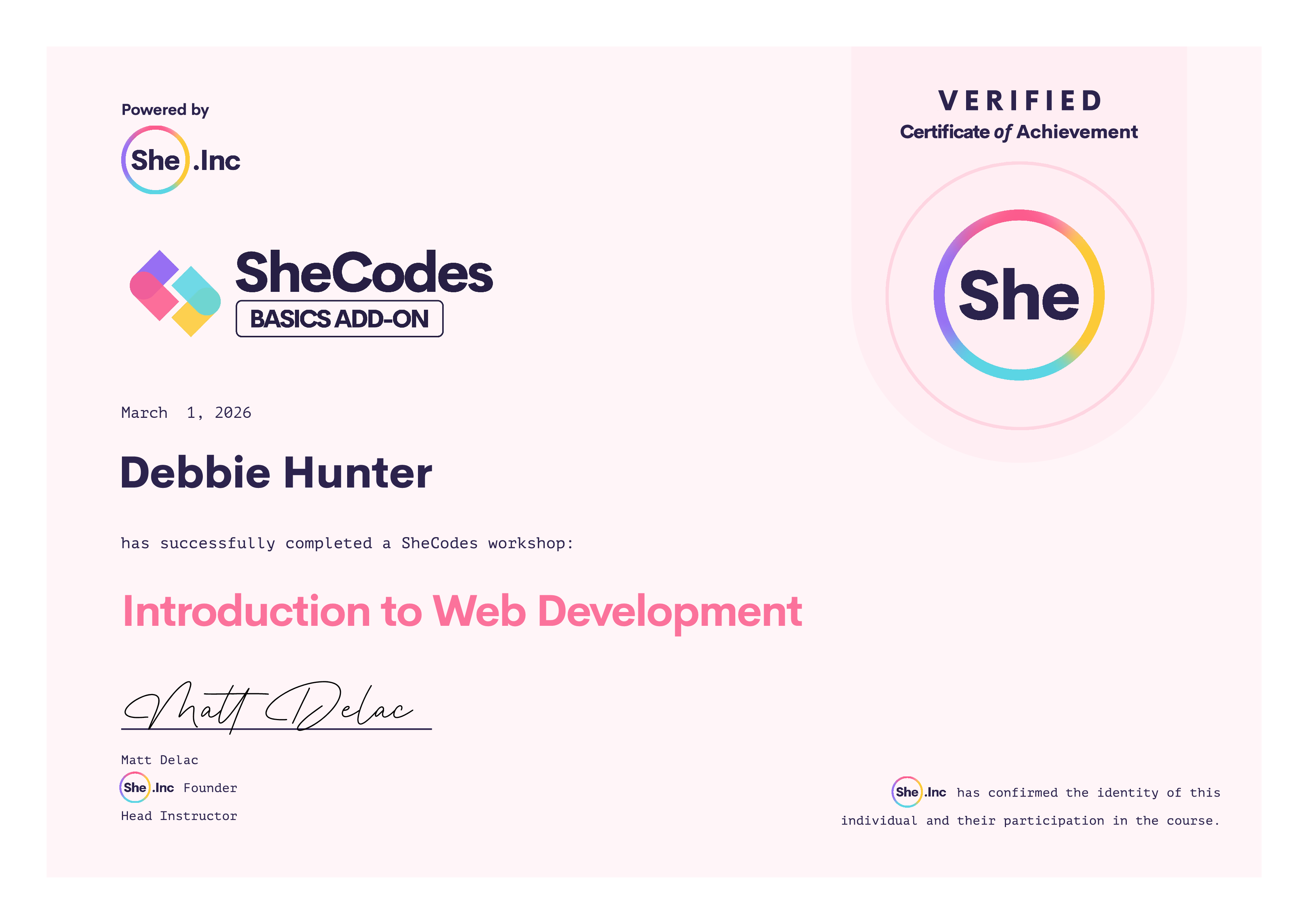 Debbie successfully graduated from at least one SheCodes Coding Workshop and is featured in the SheCodes Hall of Fame