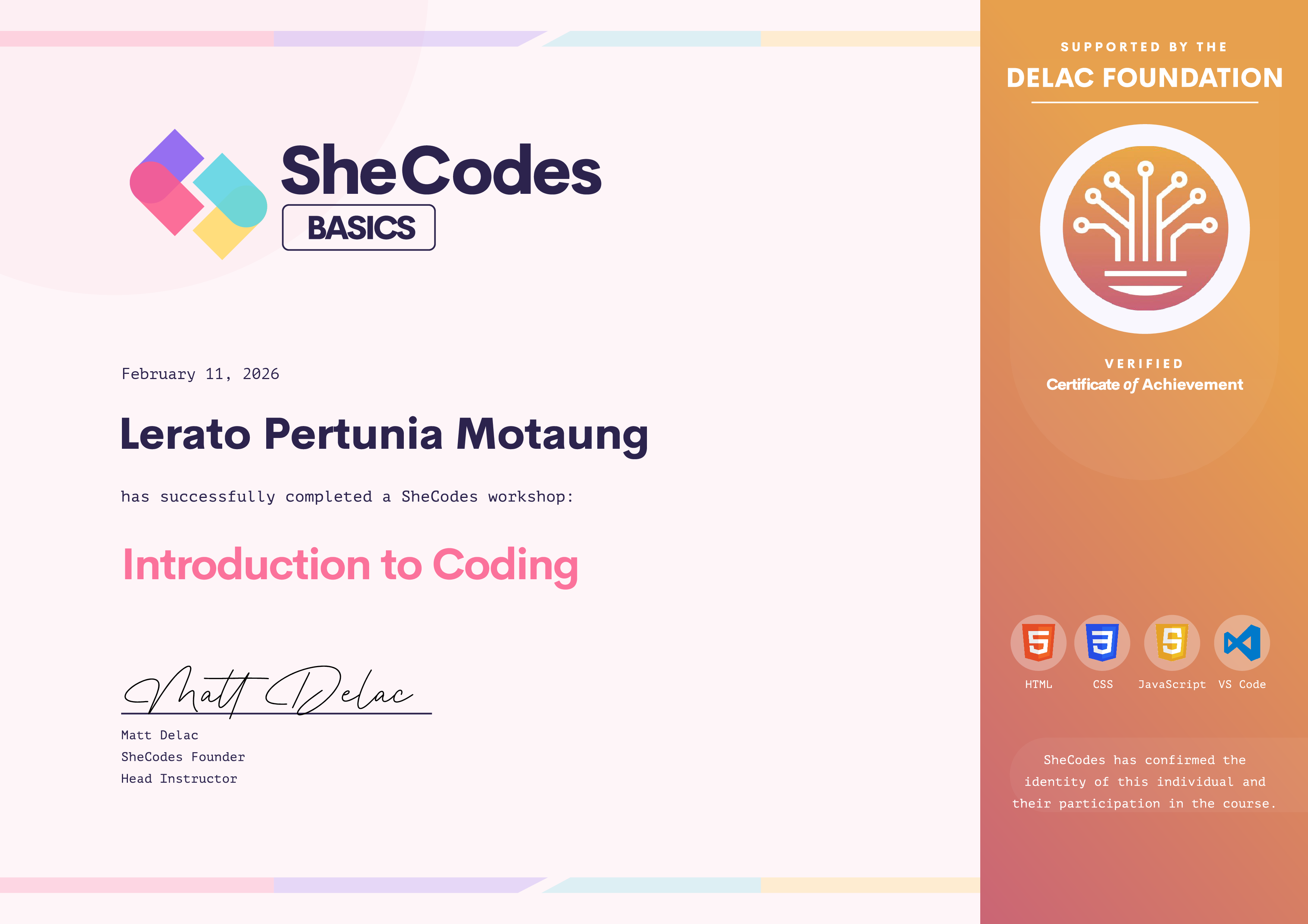 Lerato Pertunia has been fully supported by the The Delac Foundation to complete this SheCodes Workshop