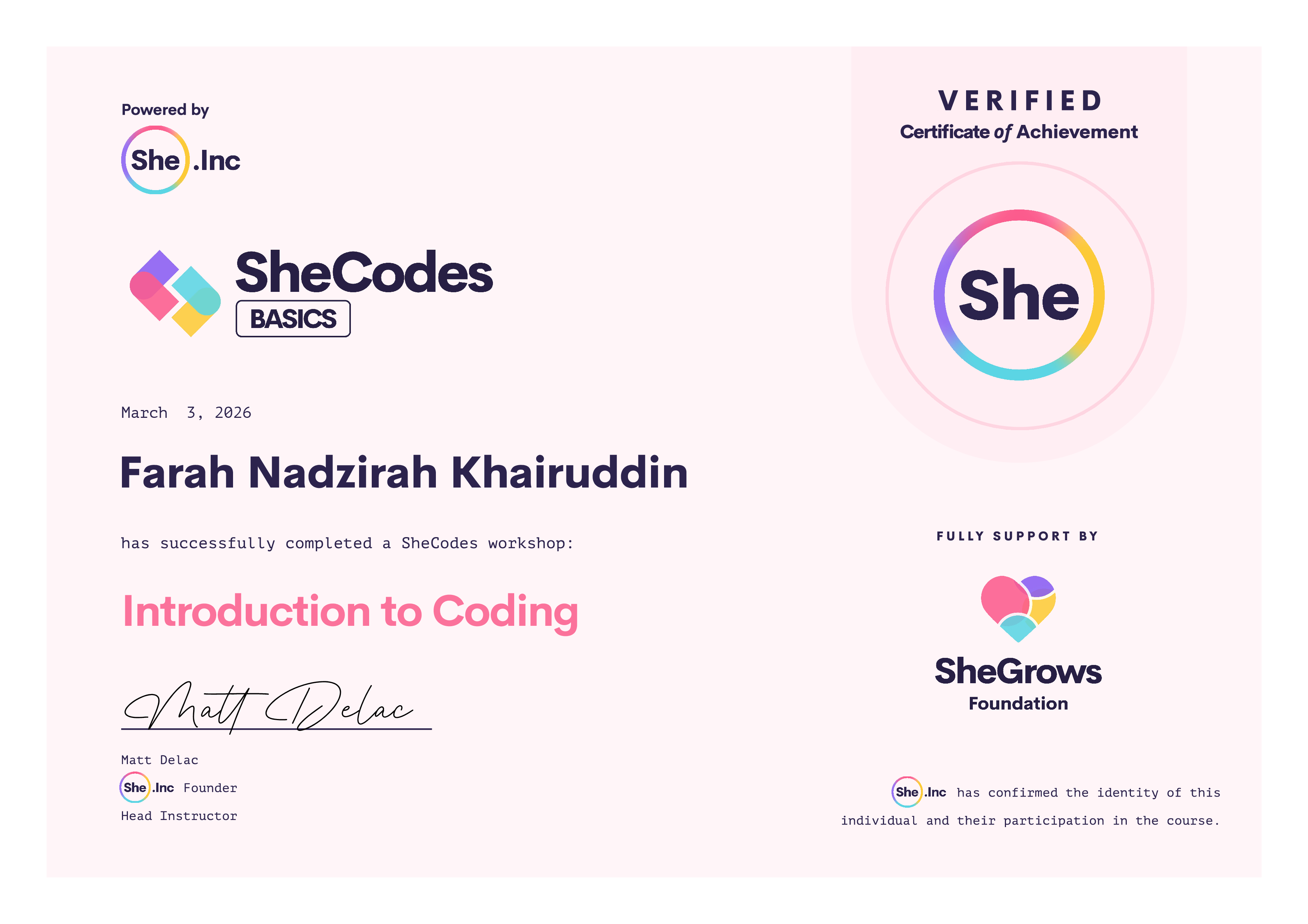 Farah Nadzirah successfully graduated from at least one SheCodes Coding Workshop and is featured in the SheCodes Hall of Fame