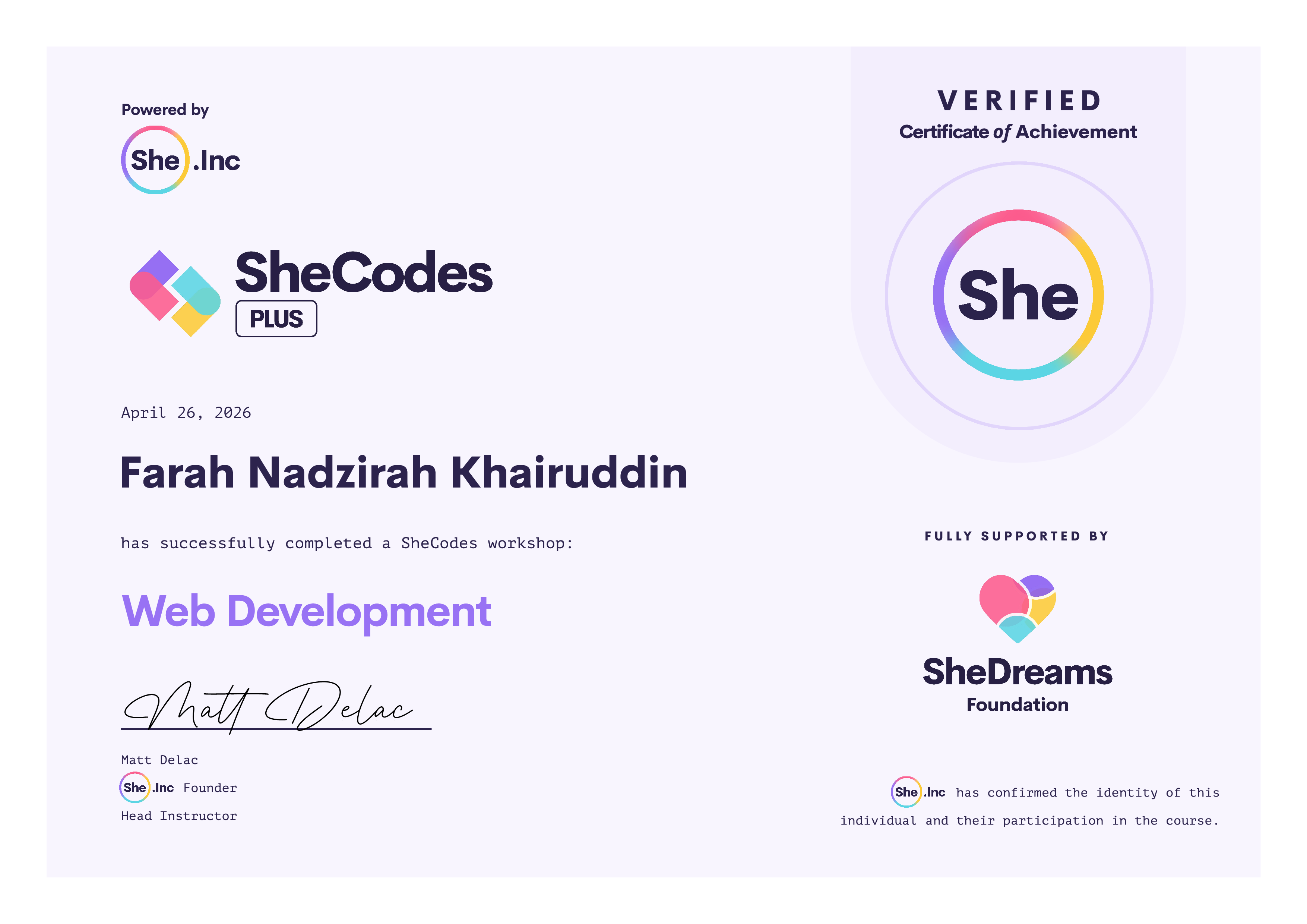 Farah Nadzirah has been fully supported by the The SheDreams Foundation to complete this SheCodes Workshop