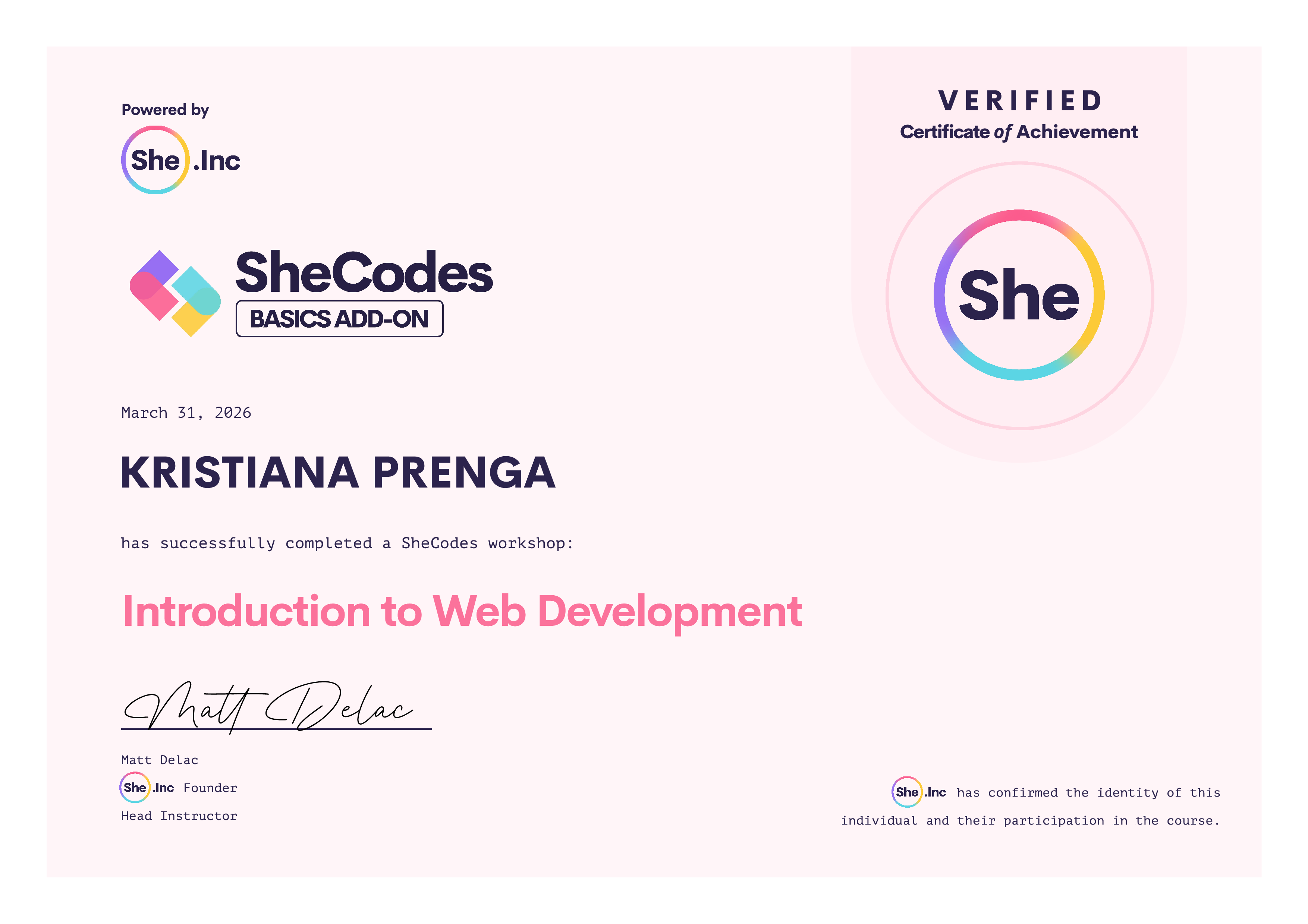 KRISTIANA successfully graduated from at least one SheCodes Coding Workshop and is featured in the SheCodes Hall of Fame