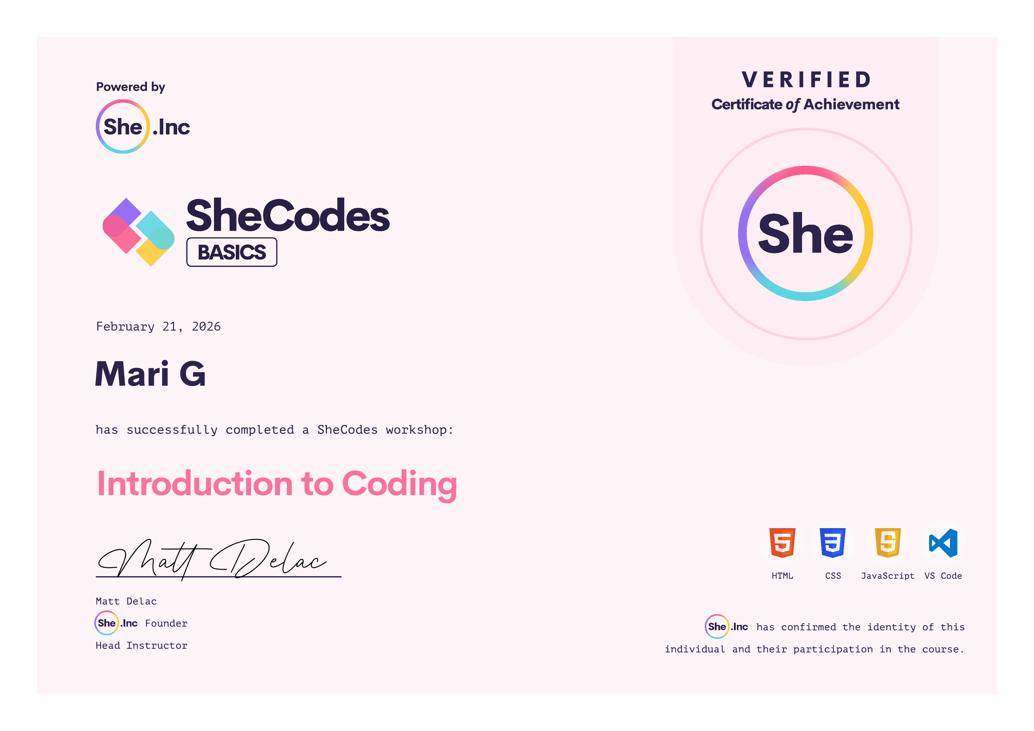 Mari successfully graduated from at least one SheCodes Coding Workshop and is featured in the SheCodes Hall of Fame