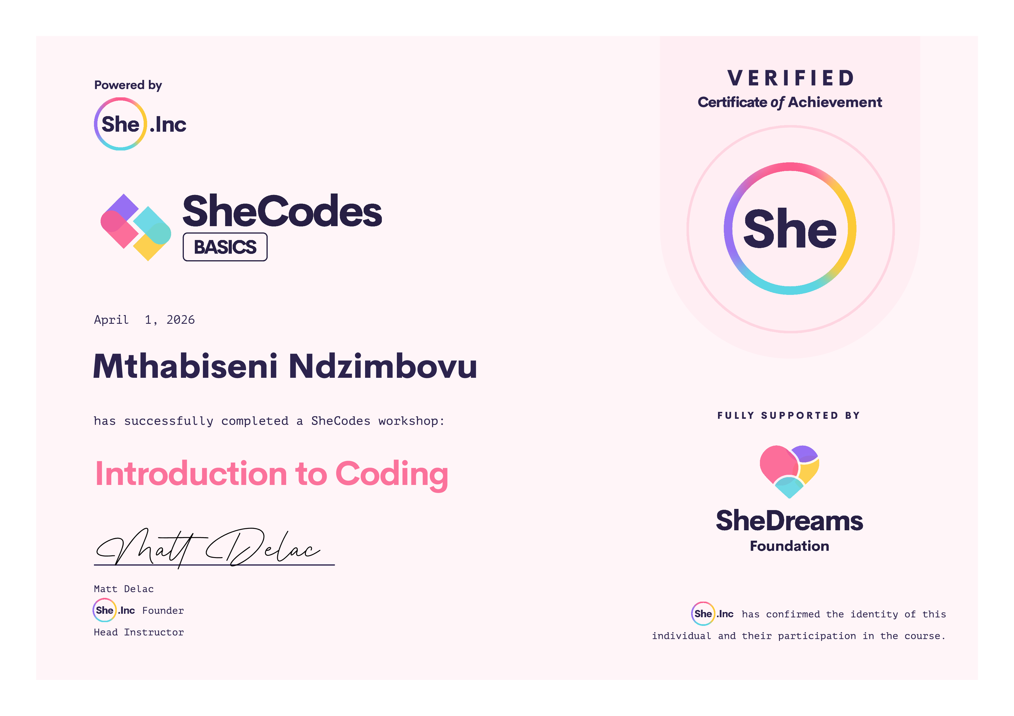 Mthabiseni has been fully supported by the The SheDreams Foundation to complete this SheCodes Workshop