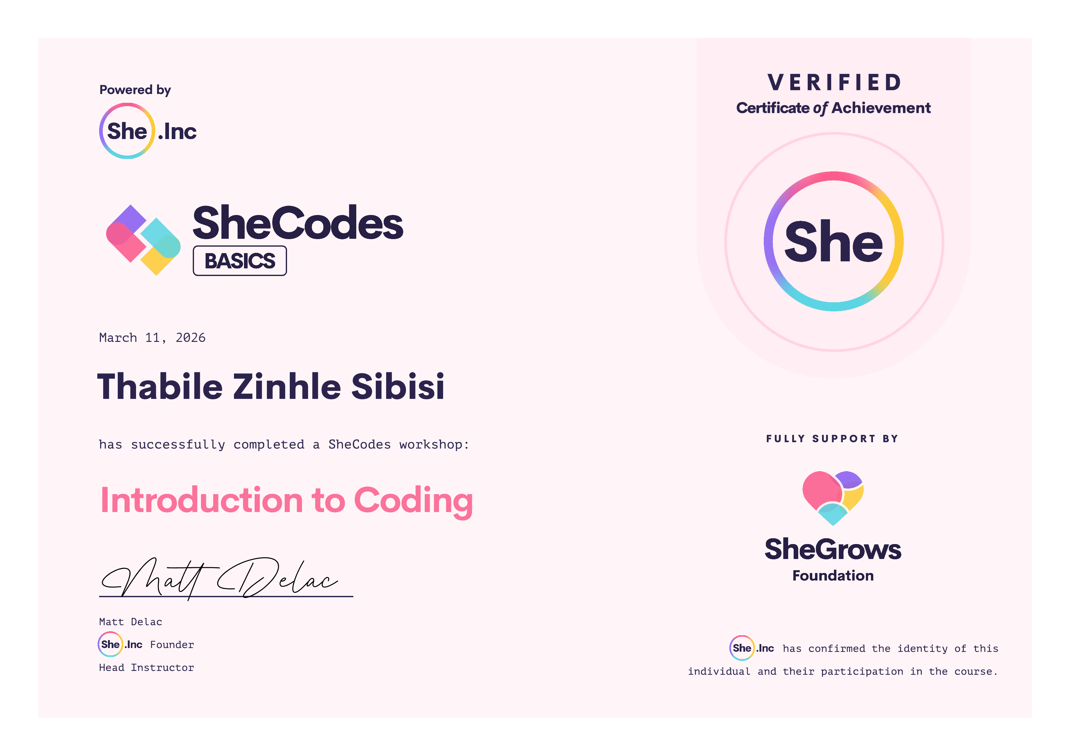 Thabile Zinhle has been fully supported by the The SheGrows Foundation to complete this SheCodes Workshop