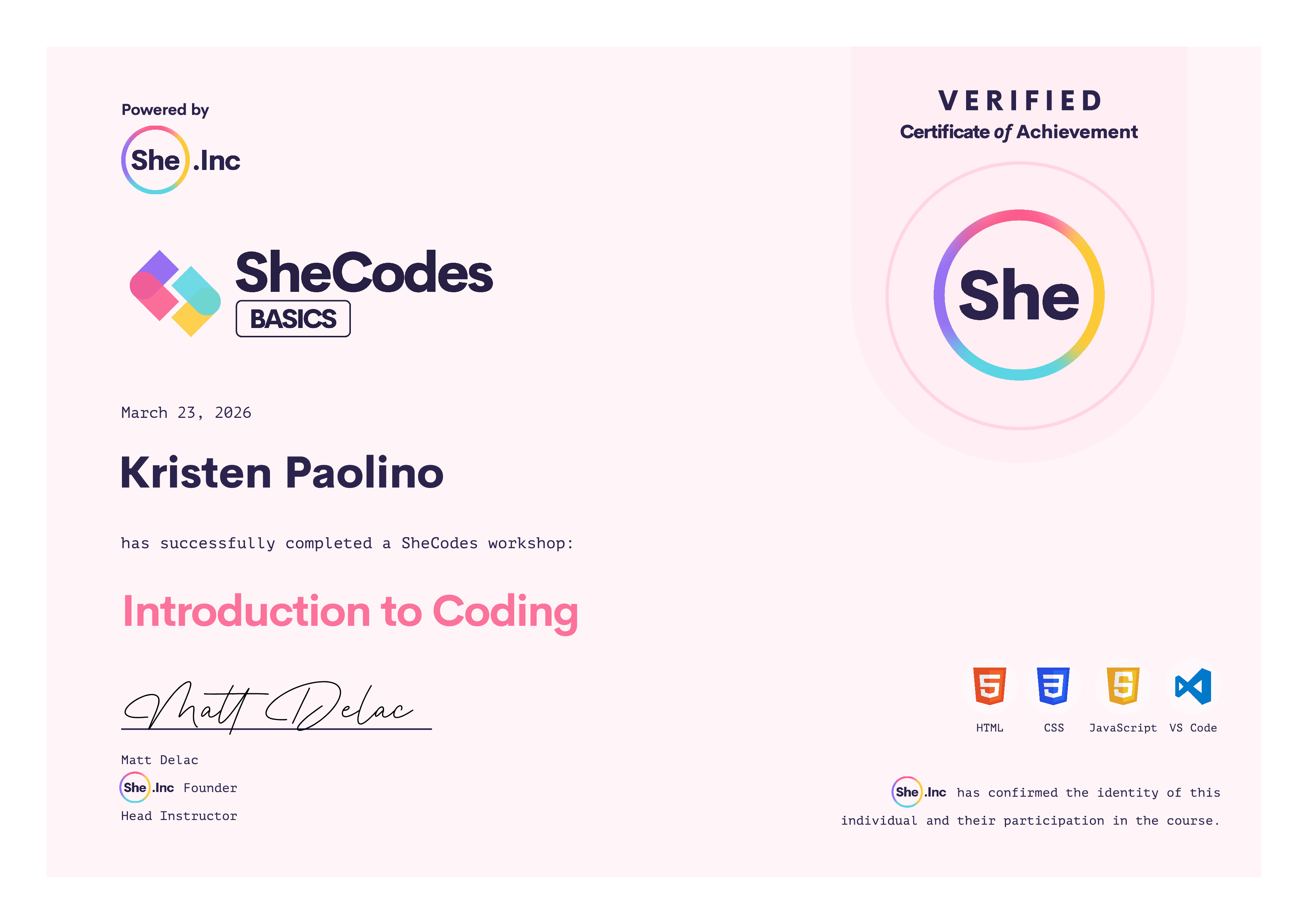 Kristen successfully graduated from at least one SheCodes Coding Workshop and is featured in the SheCodes Hall of Fame