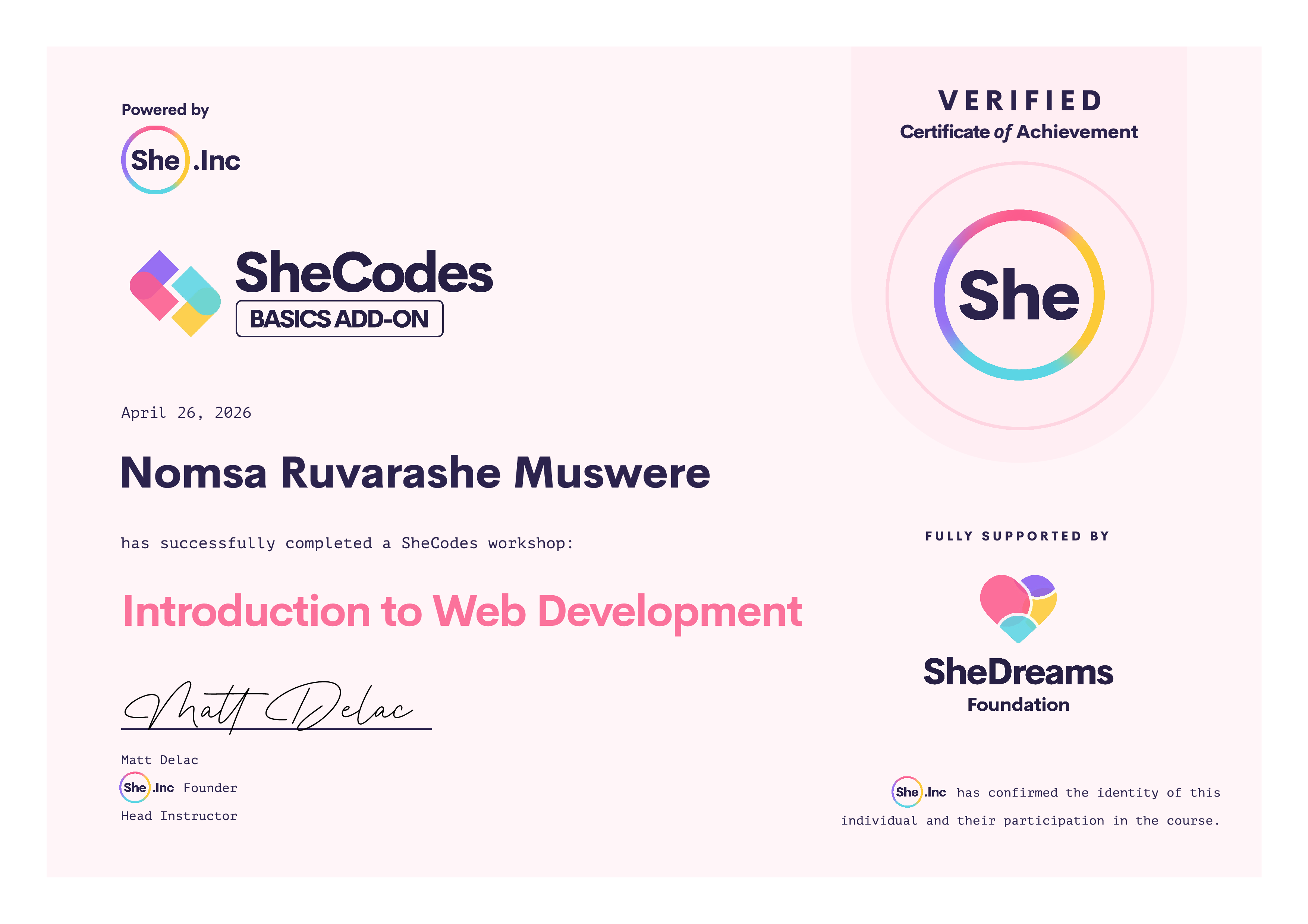 Nomsa Ruvarashe has been fully supported by the The SheDreams Foundation to complete this SheCodes Workshop