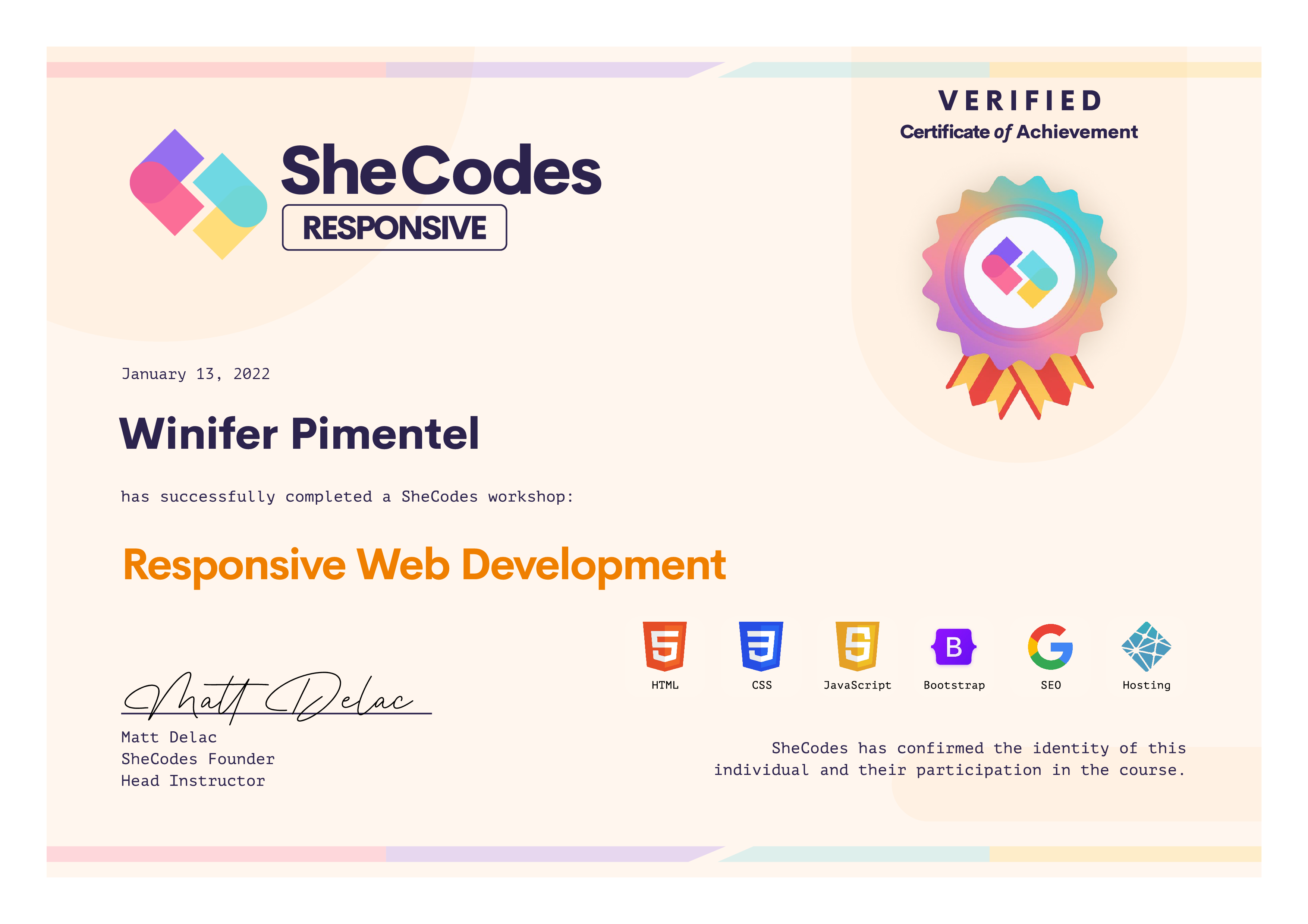 Winifer successfully graduated from at least one SheCodes Coding Workshop and is featured in the SheCodes Hall of Fame