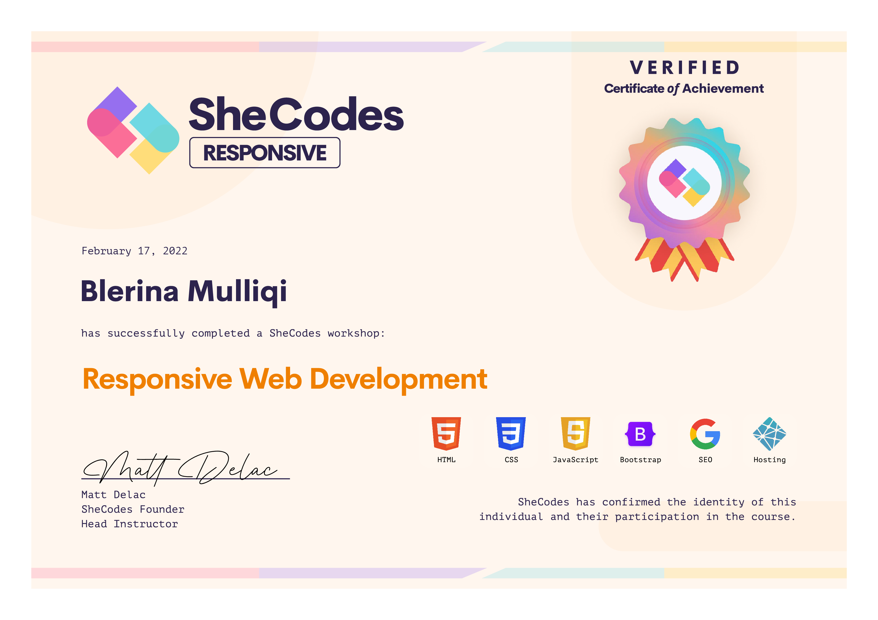 Blerina successfully graduated from at least one SheCodes Coding Workshop and is featured in the SheCodes Hall of Fame