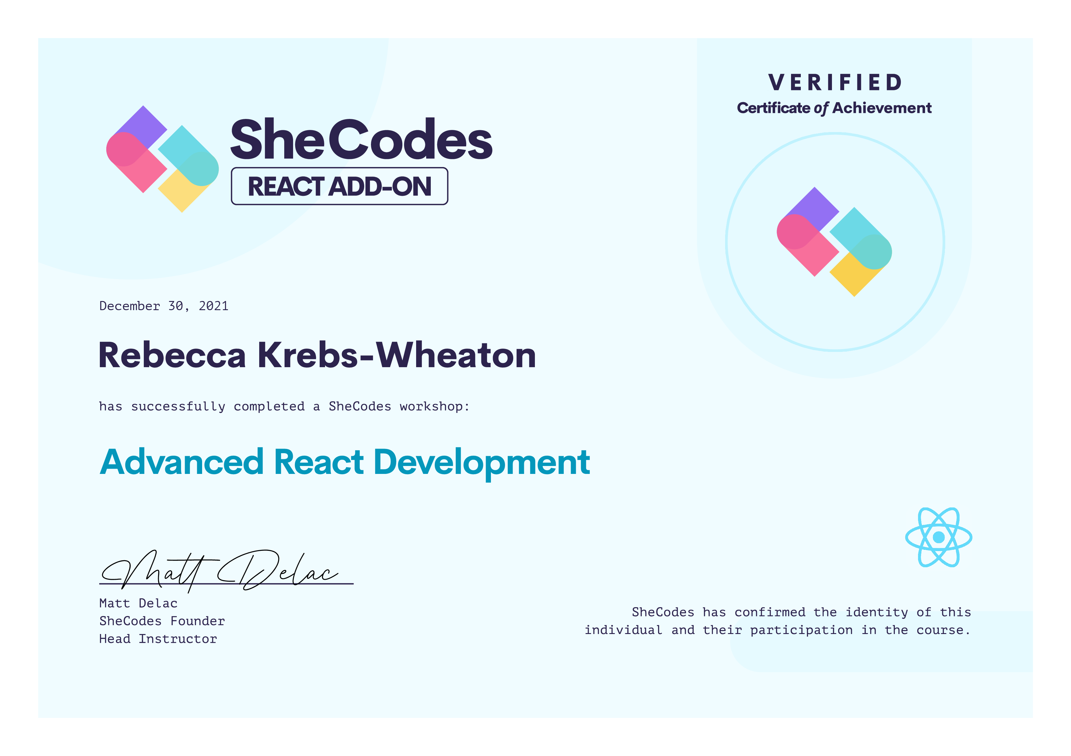 Rebecca successfully graduated from at least one SheCodes Coding Workshop and is featured in the SheCodes Hall of Fame
