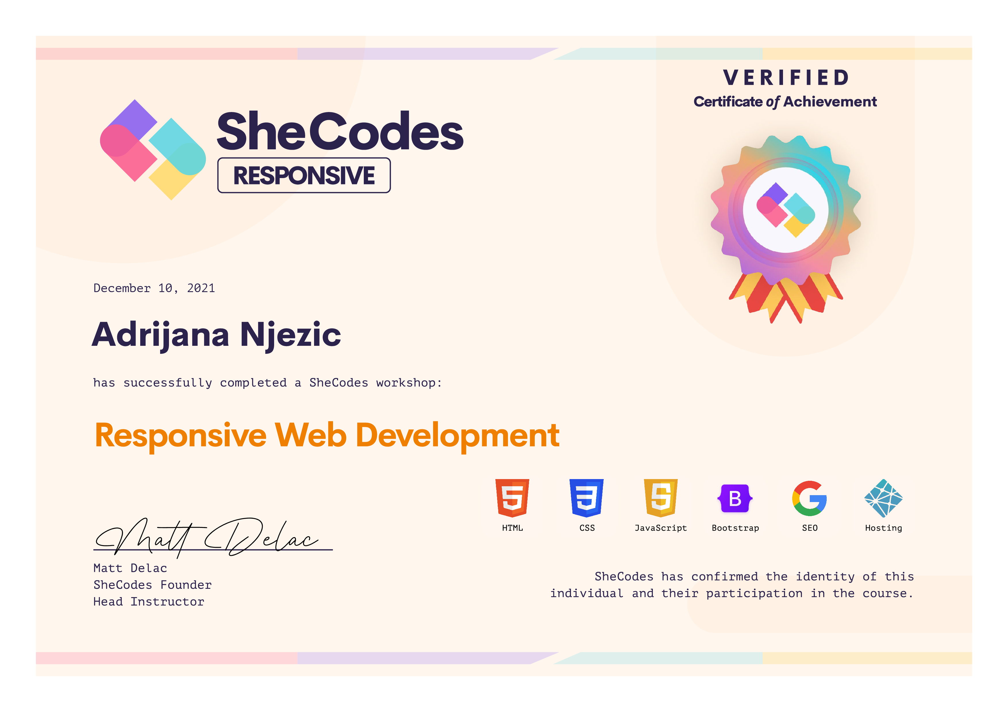 Adrijana successfully graduated from at least one SheCodes Coding Workshop and is featured in the SheCodes Hall of Fame
