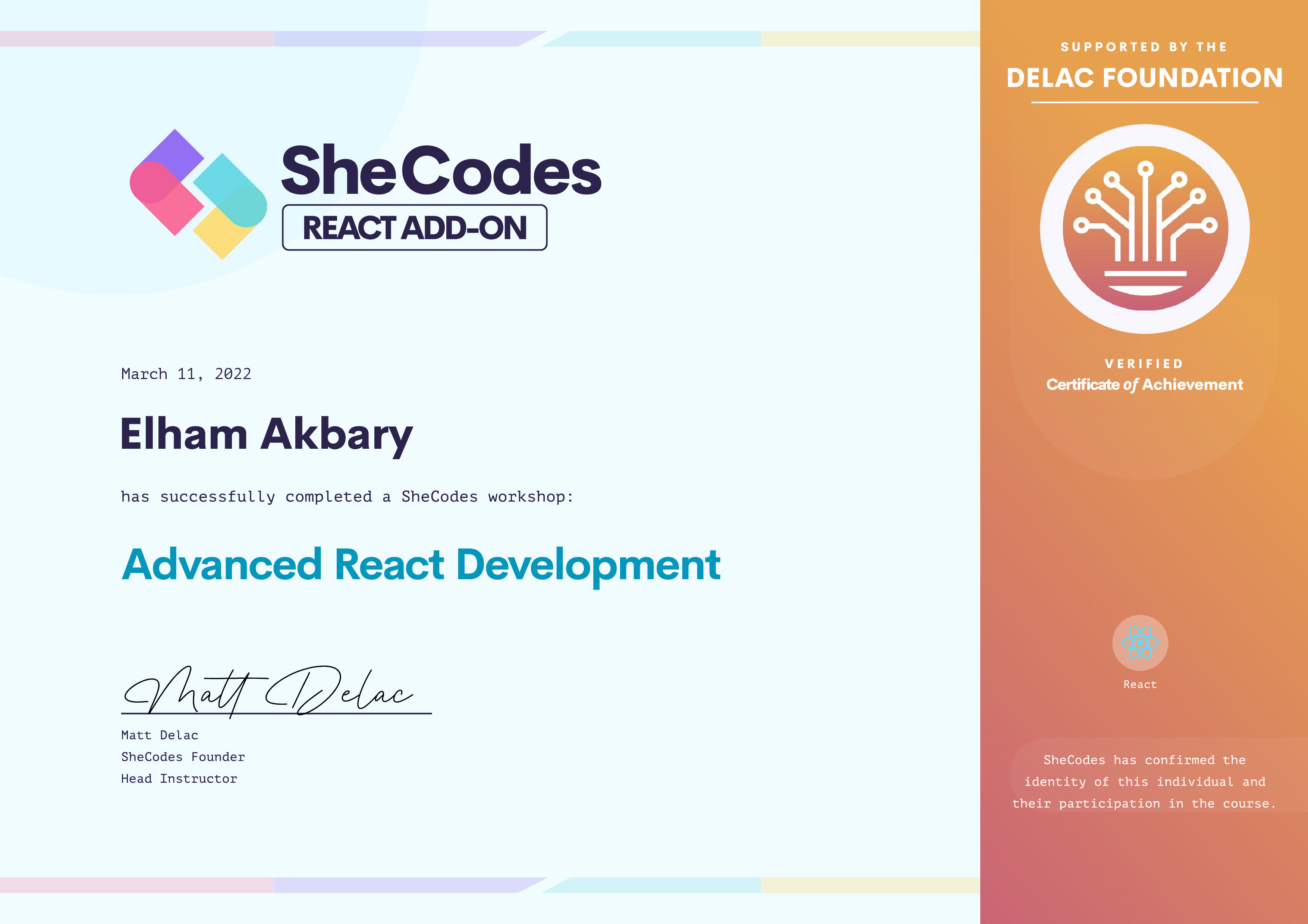 Elham has been fully supported by the Delac Foundation to complete this SheCodes Workshop