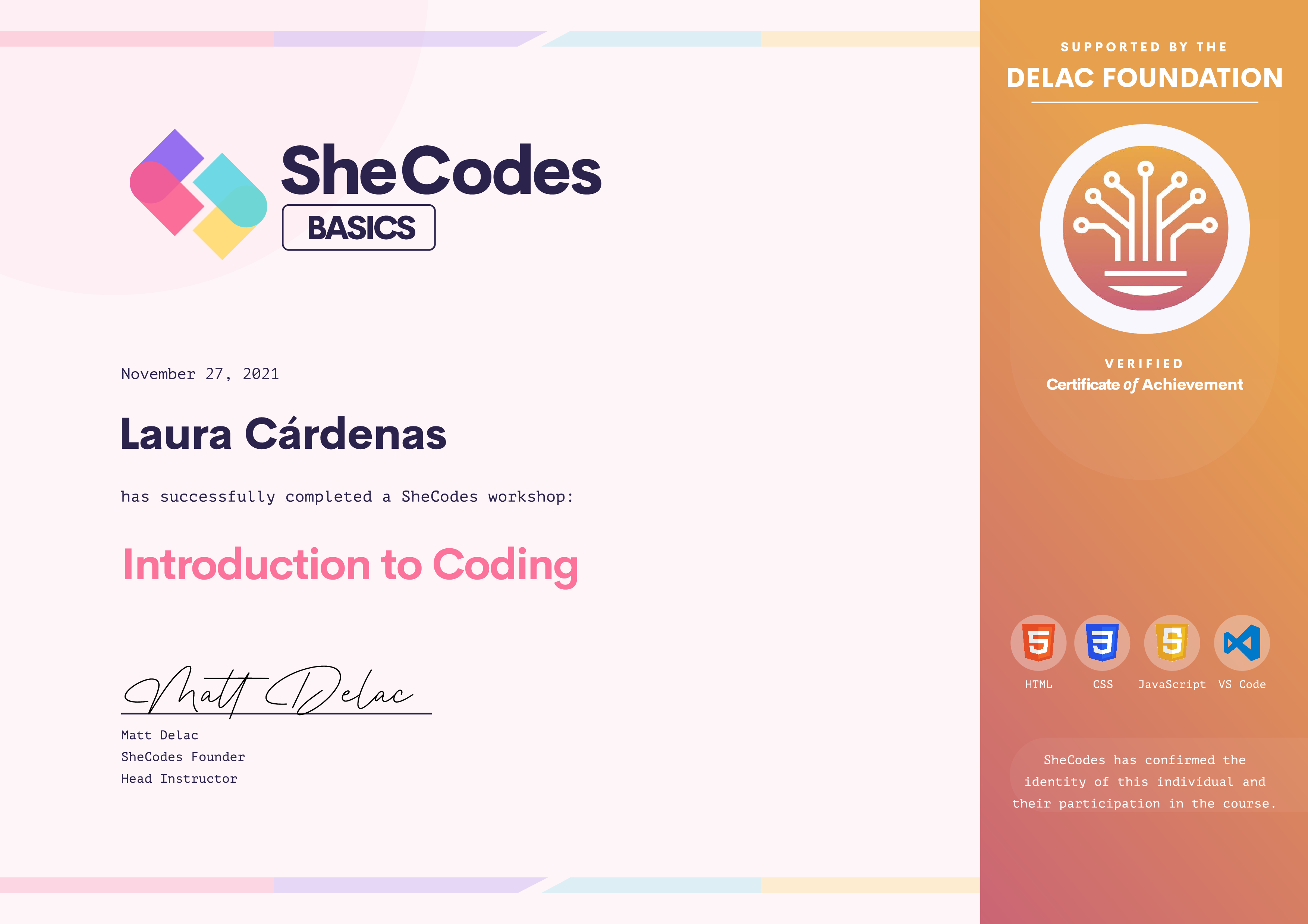 Laura has been fully supported by the Delac Foundation to complete this SheCodes Workshop