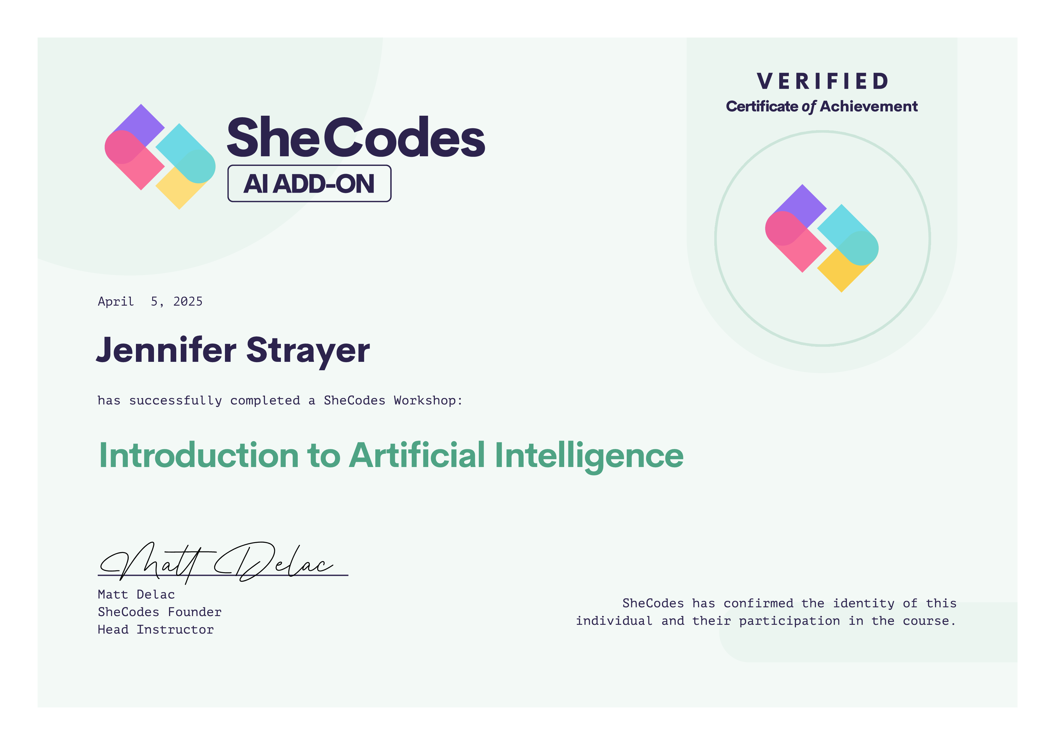 Jennifer successfully graduated from at least one SheCodes Coding Workshop and is featured in the SheCodes Hall of Fame
